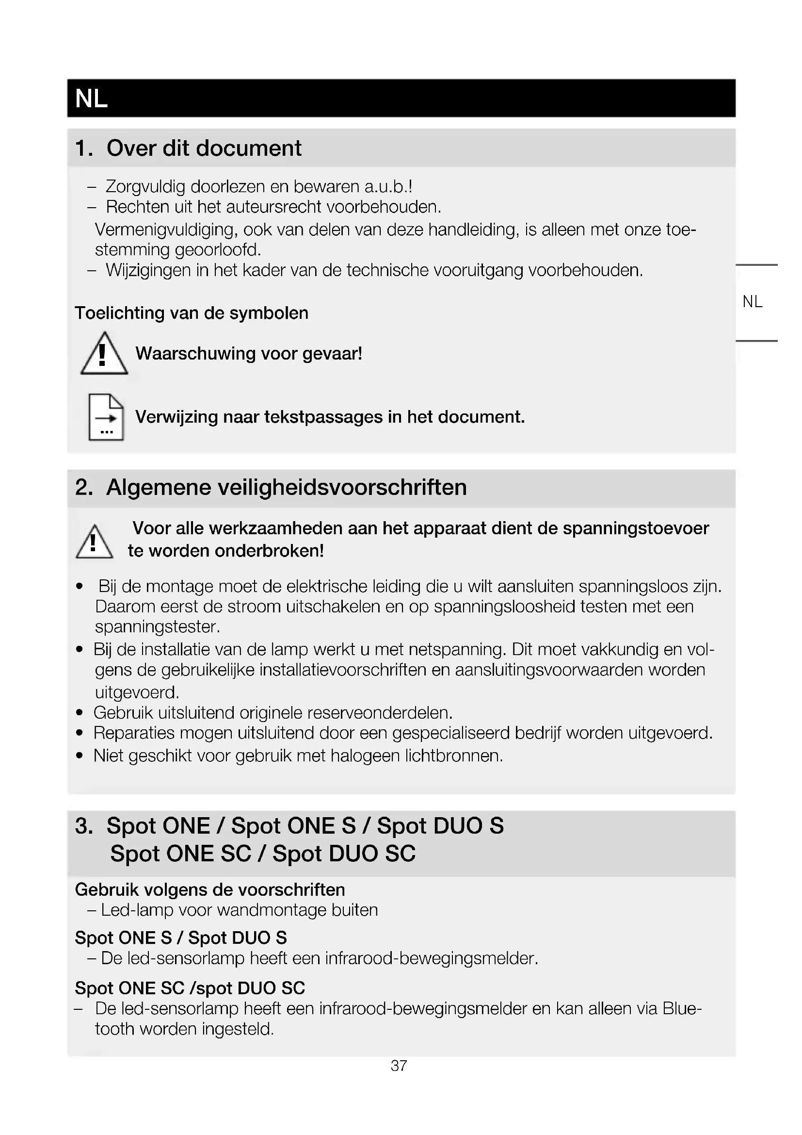 Spot ONESC / Spot DUO SC Gebruik volgens de voorschriften – Led-lamp voor wandmontage buiten Spot ONES / Spot DUOS – De led-sensorlamp heeft een infrarood-bewegingsmelder. Spot ONESC /spot DUOSC – De led-sensorlamp heeft een infrarood-bewegingsmelder en kan alleen via Blue- tooth worden ingesteld. NL38 Gebruik niet conform de voorschriften – De led-lamp kan niet worden gedimd. Niet dimbaar Bij de levering inbegrepen spot ONE (afb. 3.1) – lamp – drie schroeven – drie pluggen – drie afstandhouders Bij de levering inbegrepen spot DUO (afb. 3.2) – lamp – vier schroeven – vier pluggen – vier afstandhouders Afmetingen product Spot ONE (afb. 3.3) Spot DUO (afb. 3.4) Productoverzicht (afb. 3.5) A Wandhouder B Aansluitklem C Borgschroef D Lampvoet E Lampbehuizing F Schemerinstelling (alleen spot ONES / DUOS) G Tijdinstelling (alleen spot ONES / DUOS) Registratiebereik spot ONES / DUOS (afb. 3.6-3.8) Lichtsterkteverdeling (afb. 3.9)