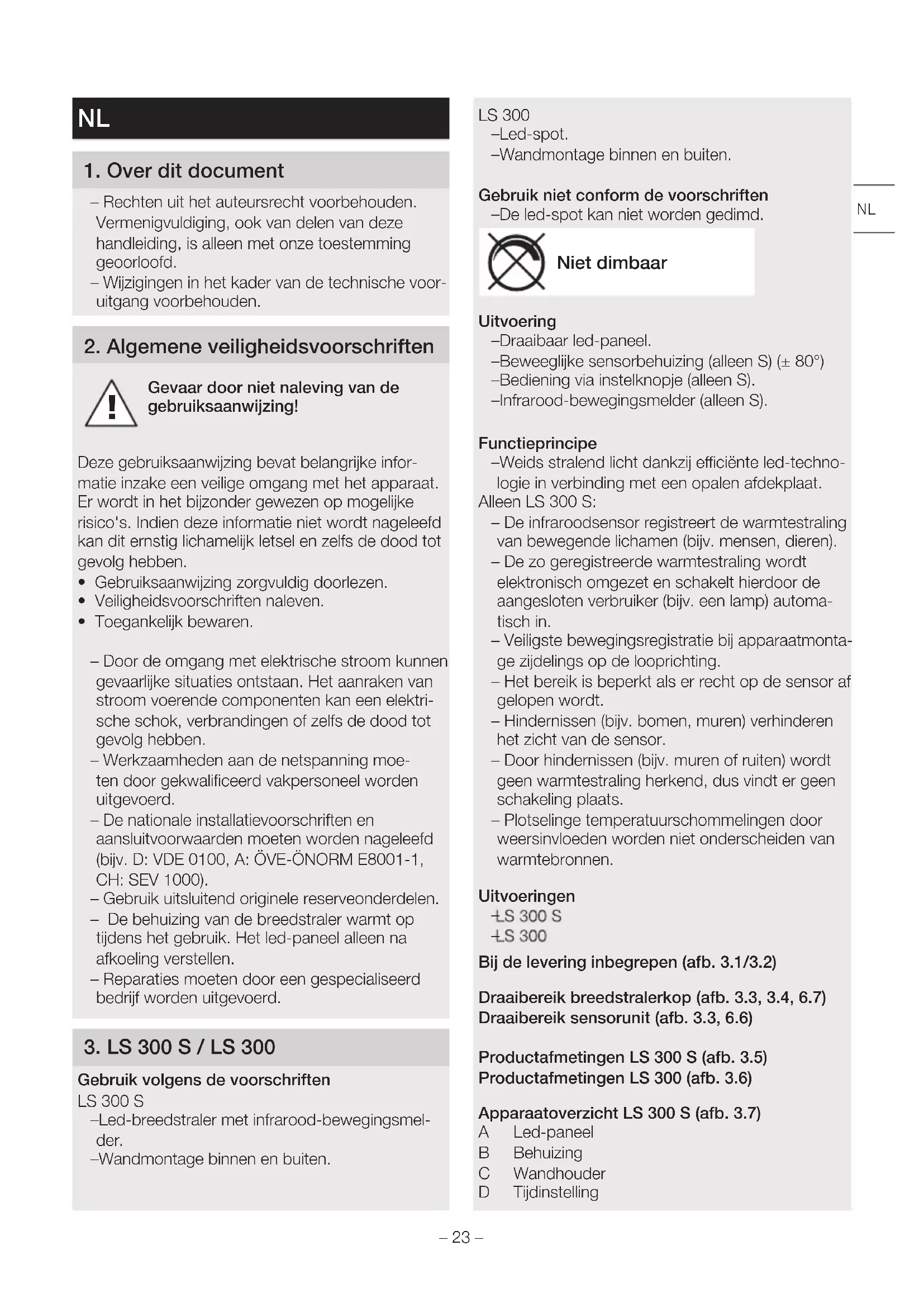 Gebruik volgens de voorschriften LS300S – Led-breedstraler met infrarood-bewegingsmel- der. – Wandmontage binnen en buiten. LS300 – Led-spot. – Wandmontage binnen en buiten. Gebruik niet conform de voorschriften – De led-spot kan niet worden gedimd. Niet dimbaar Uitvoering – Draaibaar led-paneel. – Beweeglijke sensorbehuizing (alleen S) (±80°) – Bediening via instelknopje (alleen S). – Infrarood-bewegingsmelder (alleen S). Functieprincipe – Weids stralend licht dankzij eciënte led-techno- logie in verbinding met een opalen afdekplaat. Alleen LS 300 S: – De infraroodsensor registreert de warmtestraling van bewegende lichamen (bijv. mensen, dieren). – De zo geregistreerde warmtestraling wordt elektronisch omgezet en schakelt hierdoor de aangesloten verbruiker (bijv. een lamp) automa- tisch in. – Veiligste bewegingsregistratie bij apparaatmonta- ge zijdelings op de looprichting. – Het bereik is beperkt als er recht op de sensor af gelopen wordt. – Hindernissen (bijv. bomen, muren) verhinderen het zicht van de sensor. – Door hindernissen (bijv. muren of ruiten) wordt geen warmtestraling herkend, dus vindt er geen schakeling plaats. – Plotselinge temperatuurschommelingen door weersinvloeden worden niet onderscheiden van warmtebronnen. Uitvoeringen