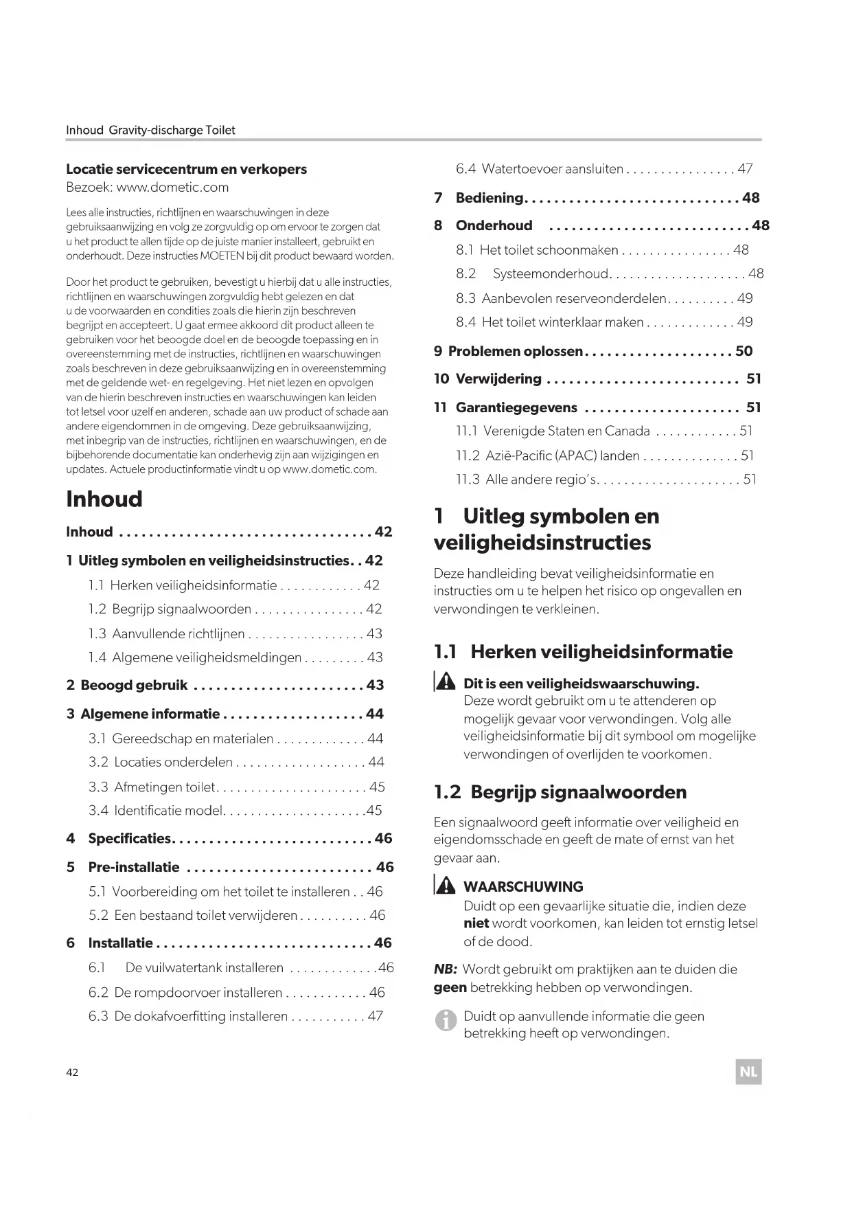 - .3 Alle andere regio’s Locatie servicecentrum en verkopersBezoek: www.dometic.comLees alle instructies, richtlijnen en waarschuwingen in deze gebruiksaanwijzing en volg ze zorgvuldig op om ervoor te zorgen dat u het product te allen tijde op de juiste manier installeert, gebruikt en onderhoudt. Deze instructies MOETEN bij dit product bewaard worden.Door het product te gebruiken, bevestigt u hierbij dat u alle instructies, richtlijnen en waarschuwingen zorgvuldig hebt gelezen en dat u de voorwaarden en condities zoals die hierin zijn beschreven begrijpt en accepteert. U gaat ermee akkoord dit product alleen te gebruiken voor het beoogde doel en de beoogde toepassing en in overeenstemming met de instructies, richtlijnen en waarschuwingen zoals beschreven in deze gebruiksaanwijzing en in overeenstemming met de geldende wet- en regelgeving. Het niet lezen en opvolgen van de hierin beschreven instructies en waarschuwingen kan leiden tot letsel voor uzelf en anderen, schade aan uw product of schade aan andere eigendommen in de omgeving. Deze gebruiksaanwijzing, met inbegrip van de instructies, richtlijnen en waarschuwingen, en de bijbehorende documentatie kan onderhevig zijn aan wijzigingen en updates. Actuele productinformatie vindt u op www.dometic.com. Inhoud 1 Uitleg symbolen en veiligheidsinstructies Deze handleiding bevat veiligheidsinformatie en instructies om u te helpen het risico op ongevallen en verwondingen te verkleinen. p. 51