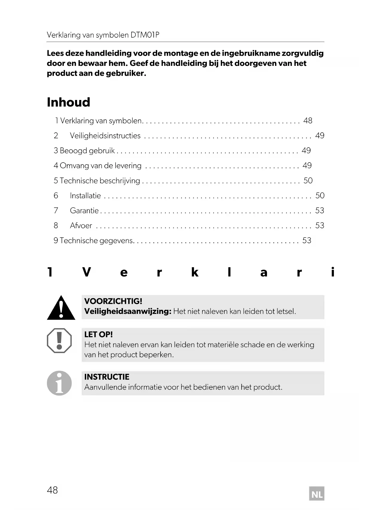 VOORZICHTIG! Veiligheidsaanwijzing: Het niet naleven kan leiden tot letsel. LET OP! Het niet naleven ervan kan leiden tot materiële schade en de werking van het product beperken. INSTRUCTIE Aanvullende informatie voor het bedienen van het product. DTM01P-M-16s.book Seite 48 Dienstag, 6. September 2016 5:51 17NL DTM01P Veiligheidsinstructies