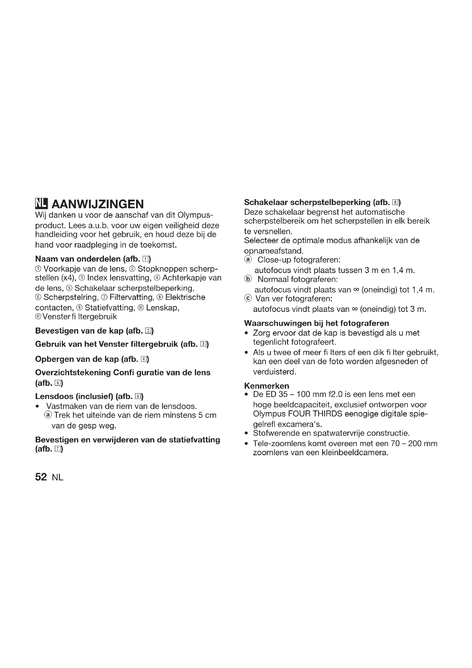 Van ver fotograferen: autofocus vindt plaats van ∞ (oneindig) tot 3 m. Waarschuwingen bij het fotograferen Zorg ervoor dat de kap is bevestigd als u met tegenlicht fotografeert. Als u twee of meer fi lters of een dik fi lter gebruikt, kan een deel van de foto worden afgesneden of verduisterd. Kenmerken De ED 35 – 100 mm f2.0 is een lens met een hoge beeldcapaciteit, exclusief ontworpen voor Olympus FOUR THIRDS eenogige digitale spie- gelrefl excamera's. Stofwerende en spatwatervrije constructie. Tele-zoomlens komt overeen met een 70 – 200 mm zoomlens van een kleinbeeldcamera.