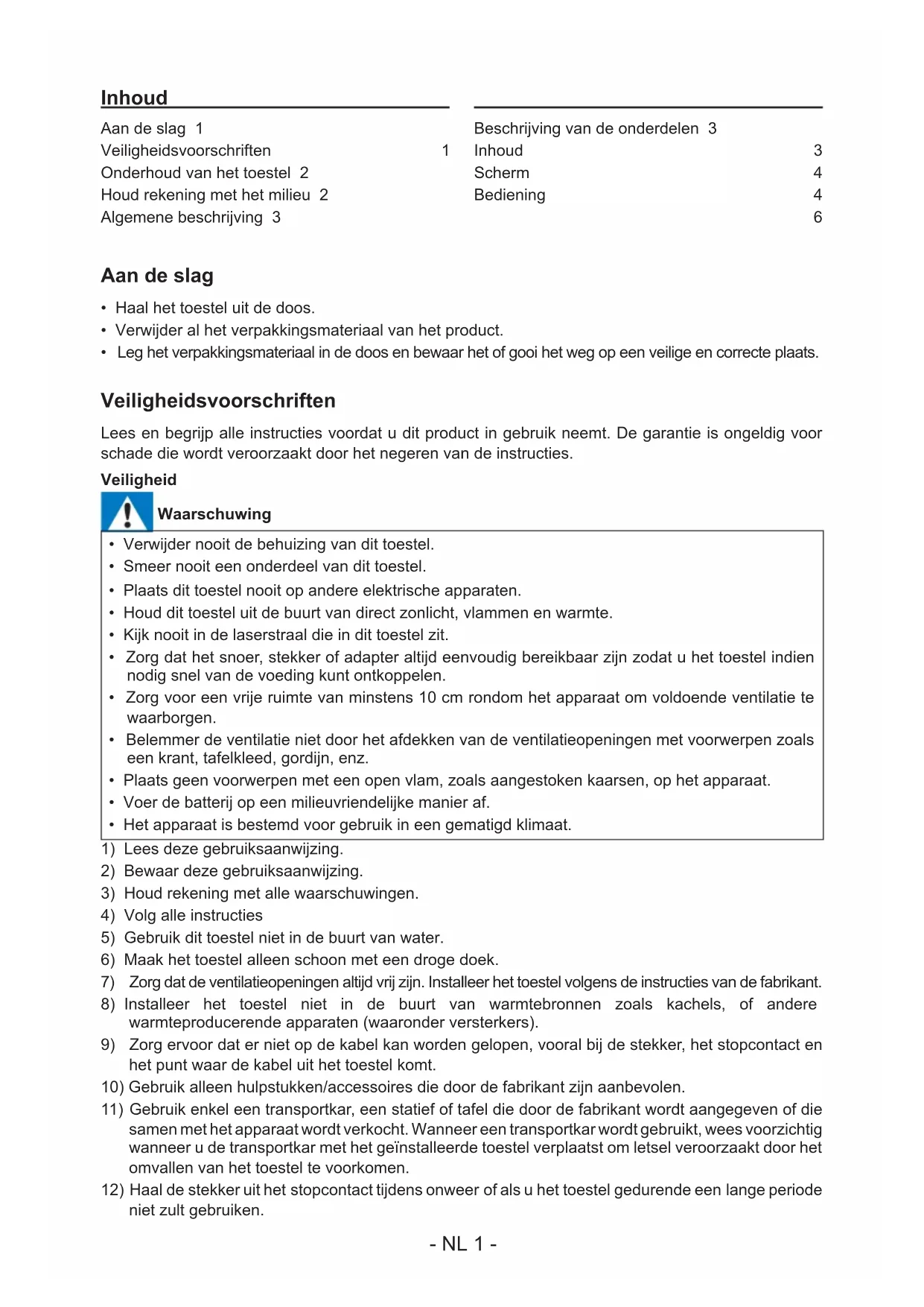 - Leg het verpakkingsmateriaal in de doos en bewaar het of gooi het weg op een veilige en correcte plaats. Veiligheidsvoorschriften Lees en begrijp alle instructies voordat u dit product in gebruik neemt. De garantie is ongeldig voor schade die wordt veroorzaakt door het negeren van de instructies. Veiligheid Waarschuwing