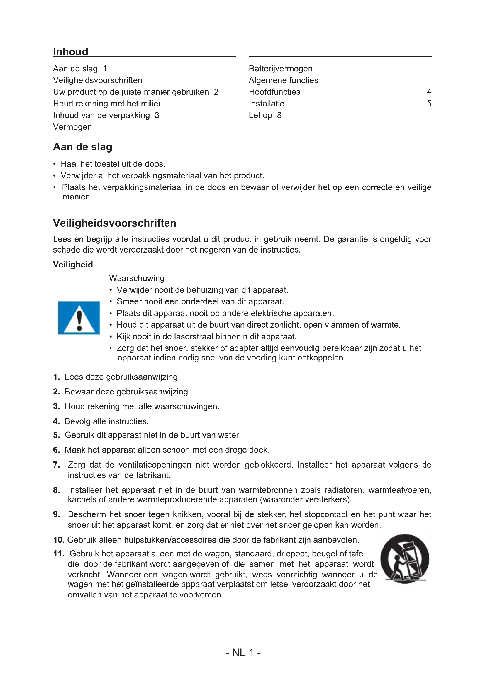 ALVORENS DEZE EENHEID TE BEDIENEN, EN BEWAAR DIT BOEKJE VOOR UW ADMINISTRATIE. NL- NL 1 - Inhoud Aan de slag 1 Veiligheidsvoorschriften Uw product op de juiste manier gebruiken 2 Houd rekening met het milieu Inhoud van de verpakking 3 Vermogen Batterijvermogen Algemene functies Hoofdfuncties 4 Installatie 5 Let op 8 Aan de slag