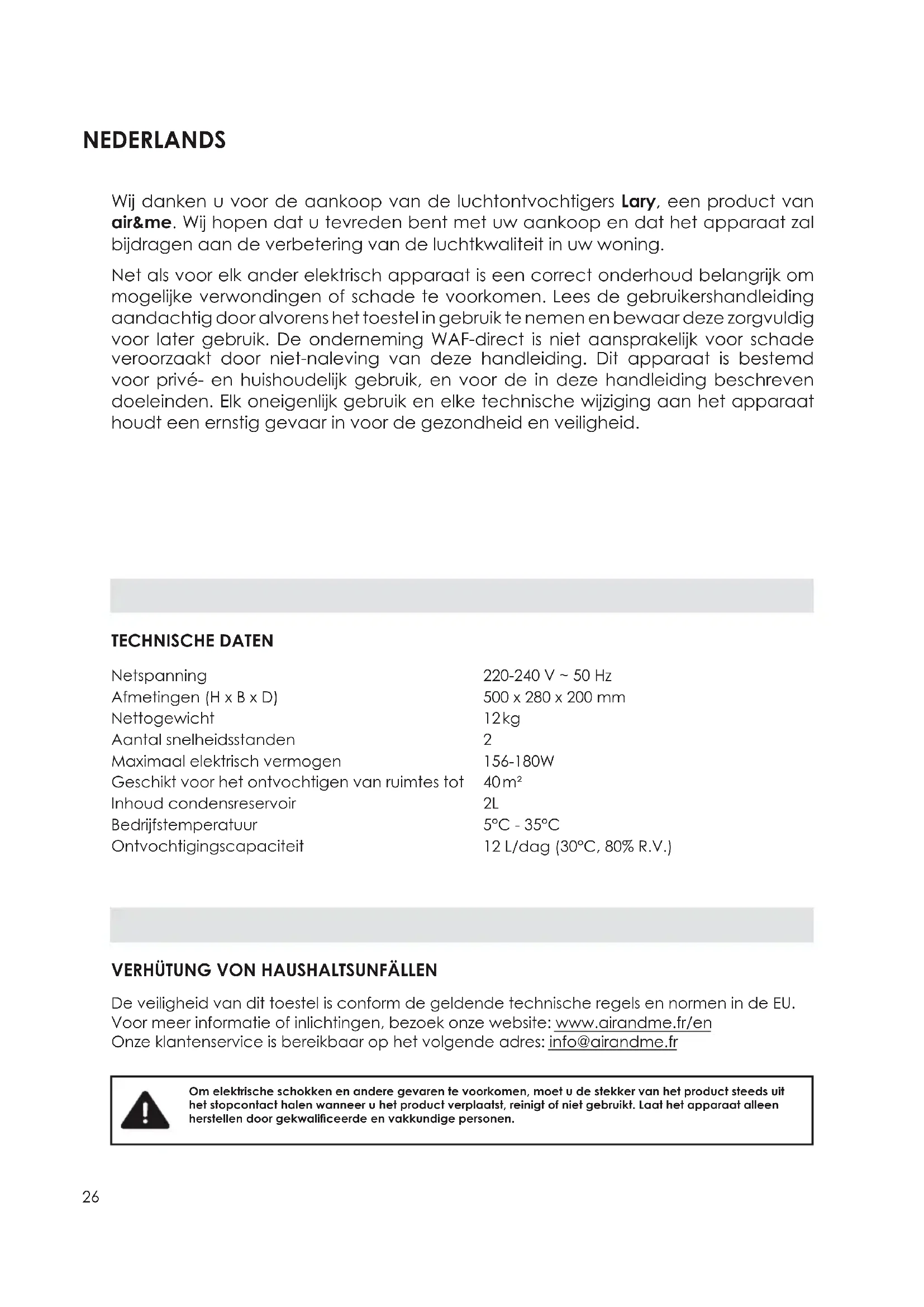 www.airandme.fr/en 30FAQ Probleem Oorzaak Oplossing Het apparaat start niet > Het product is niet correct aangesloten of de spanning van het apparaat komt niet overeen met de netspanning. > Controleer de netspanning en het elektriciteitsnet. Steek vervolgens de stekker opnieuw in het stopcontact. Vermijd het gebruik van tafelcontactdozen en multistekkers. > Er is een probleem met het elektriciteitsnet van de woning. > Het condensreservoir is vol. > Maak het condensreservoir leeg. > Het condensreservoir is niet correct geïnstalleerd. > Duw het reservoir op de juiste manier terug in de luchtontvochtiger. Het apparaat werkt minder goed (minder water in het reservoir) > De voorlter is verontreinigd en belemmert de luchtstroom. > Maak de voorlter schoon. > De luchtinlaat of -uitlaat is geblokkeerd. > Laat minstens 20 cm ruimte vrij aan de achterzijde, voorzijde en zijkanten van het apparaat. > De temperatuur is te laag. > Bij een temperatuur onder 15°C wordt de “anti-vries”-modus geactiveerd. Om deze reden functioneert het apparaat niet op maximale ontvochtigingscapaciteit. > De luchtvochtigheid in de ruimte is al laag. Abnormaal geluid > De ventilator is geblokkeerd. > Controleer of er voorwerpen zijn die de luchtstroom hinderen of belemmeren. > Het apparaat functioneert niet correct. > Neem contact op met de klantenservice van de winkel waar u het apparaat hebt gekocht. Op het display verschijnt “E2” > Probleem met de vochtigheidssensor. > Neem contact op met de klantenservice van de winkel waar u het apparaat hebt gekocht. Op het display verschijnt “LO” > De luchtvochtigheid is minder dan 35%. Het apparaat stopt voor de veiligheid. > Verhoog de luchtvochtigheid in de ruimte met een luchtbevochtiger (www.airandme.fr/en/air-humidier). Op het display verschijnt “HI” > Het luchtvochtigheidsniveau is hoger dan 95%. Het apparaat stopt voor de veiligheid. Op het display verschijnt “CL” > De omgevingstemperatuur is lager dan 5°C. Het apparaat stopt voor de veiligheid. > Verhoog de kamertemperatuur met een ventilatorkachel (www. airandme.fr/en/fan-heater-air). Op het display verschijnt “CH” > De omgevingstemperatuur is hoger dan 35°C. Het apparaat stopt voor de veiligheid. 31Dziękujemy za zakup osuszacza powietrza Lary marki air&me. Mamy nadzieję, że będziesz zadowolony z efektów pracy urządzenia. Tak jak w przypadku wszystkich urządzeń elektronicznych produkt należy użytkować zgodnie z przeznaczeniem, aby uniknąć szkód w postaci uszkodzenia produktu i/ lub obrażeń ciała. Przed podłączeniem urządzenia do sieci elektrycznej prosimy o dokładne zapoznanie się z niniejszą instrukcją oraz o zachowanie jej na później. Zastrzegamy, że nie ponosimy żadnej odpowiedzialności za szkody poniesione w wyniku użytkowania urządzenia niezgodnie z niniejszą instrukcją. Urządzenie jest przeznaczone do użytku domowego, w celach opisanych w instrukcji. Korzystanie z urządzenia w innych celach może stanowić ryzyko dla zdrowia i życia. POLSKI