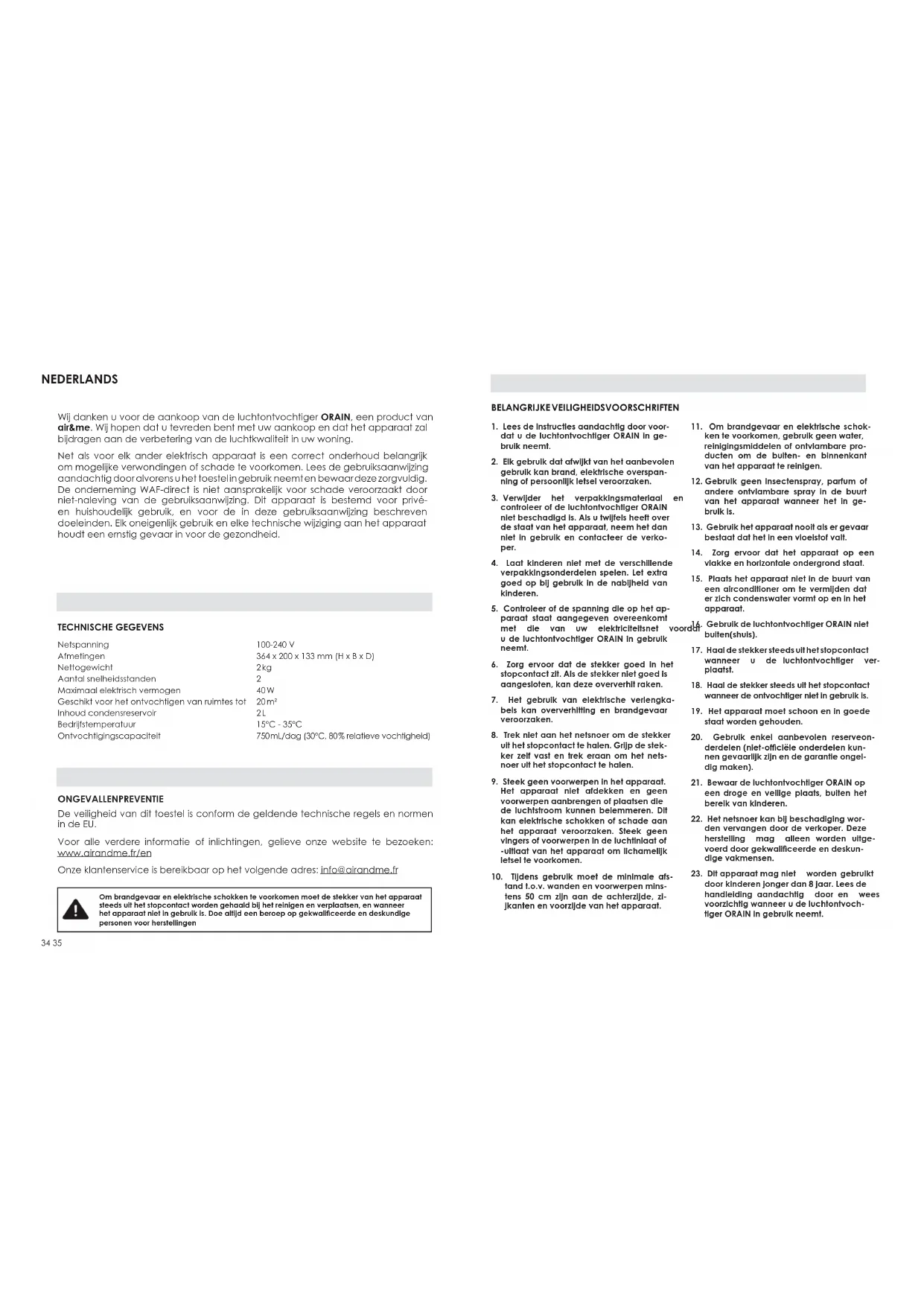 dat u de luchtontvochtiger ORAIN in ge- bruik neemt. 2. Elk gebruik dat afwijkt van het aanbevolen gebruik kan brand, elektrische overspan- ning of persoonlijk letsel veroorzaken. 3. Verwijder het verpakkingsmateriaal en controleer of de luchtontvochtiger ORAIN niet beschadigd is. Als u twijfels heeft over de staat van het apparaat, neem het dan niet in gebruik en contacteer de verko- per.
