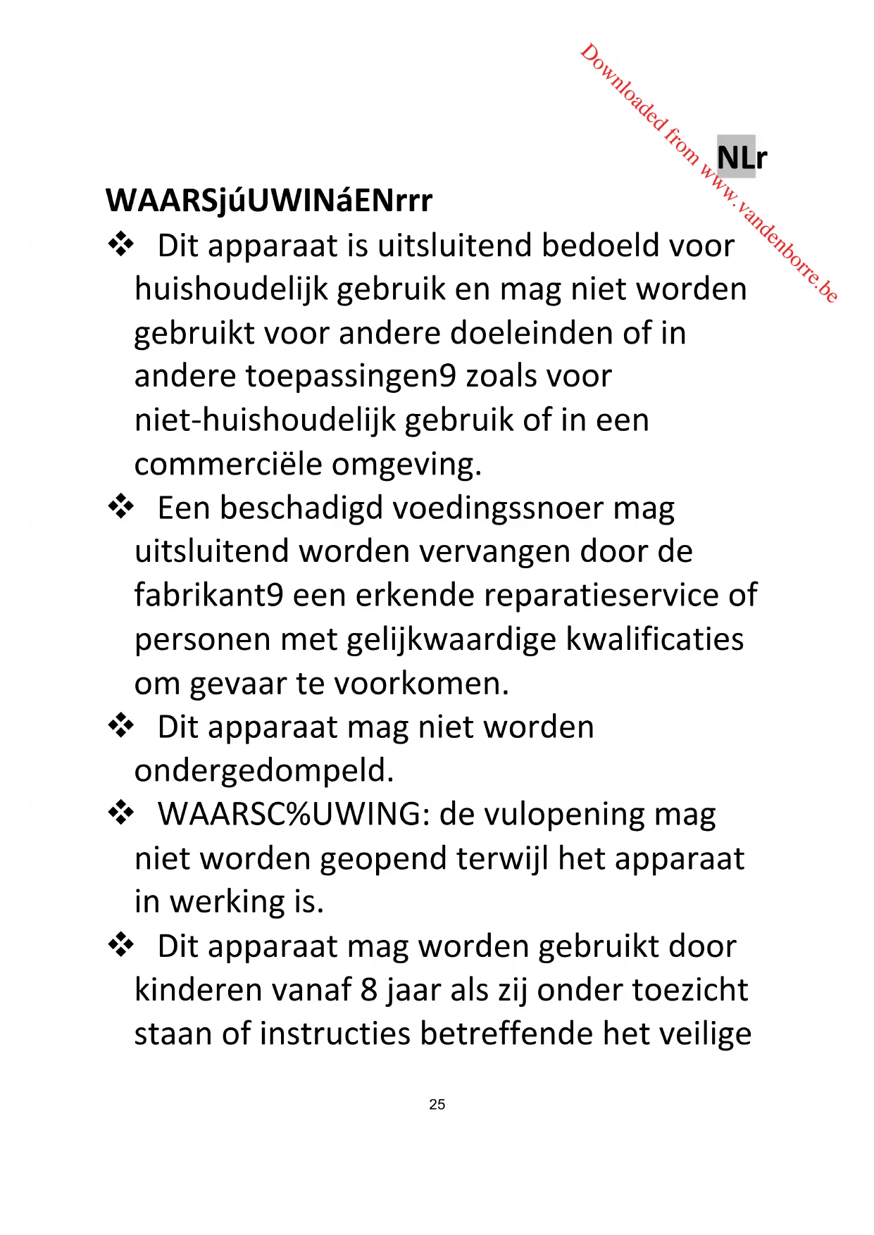 WAARSCHUWINGEN Dit apparaat is uitsluitend bedoeld voor huishoudelijk gebruik en mag niet worden gebruikt voor andere doeleinden of in andere toepassingen, zoals voor niet-huishoudelijk gebruik of in een commerciële omgeving. Een beschadigd voedingssnoer mag uitsluitend worden vervangen door de fabrikant, een erkende reparatieservice of personen met gelijkwaardige kwalificaties om gevaar te voorkomen. Dit apparaat mag niet worden ondergedompeld. WAARSCHUWING: de vulopening mag niet worden geopend terwijl het apparaat in werking is. Dit apparaat mag worden gebruikt door kinderen vanaf 8 jaar als zij onder toezicht staan of instructies betreffende het veilige Downloaded from www.vandenborre.be26