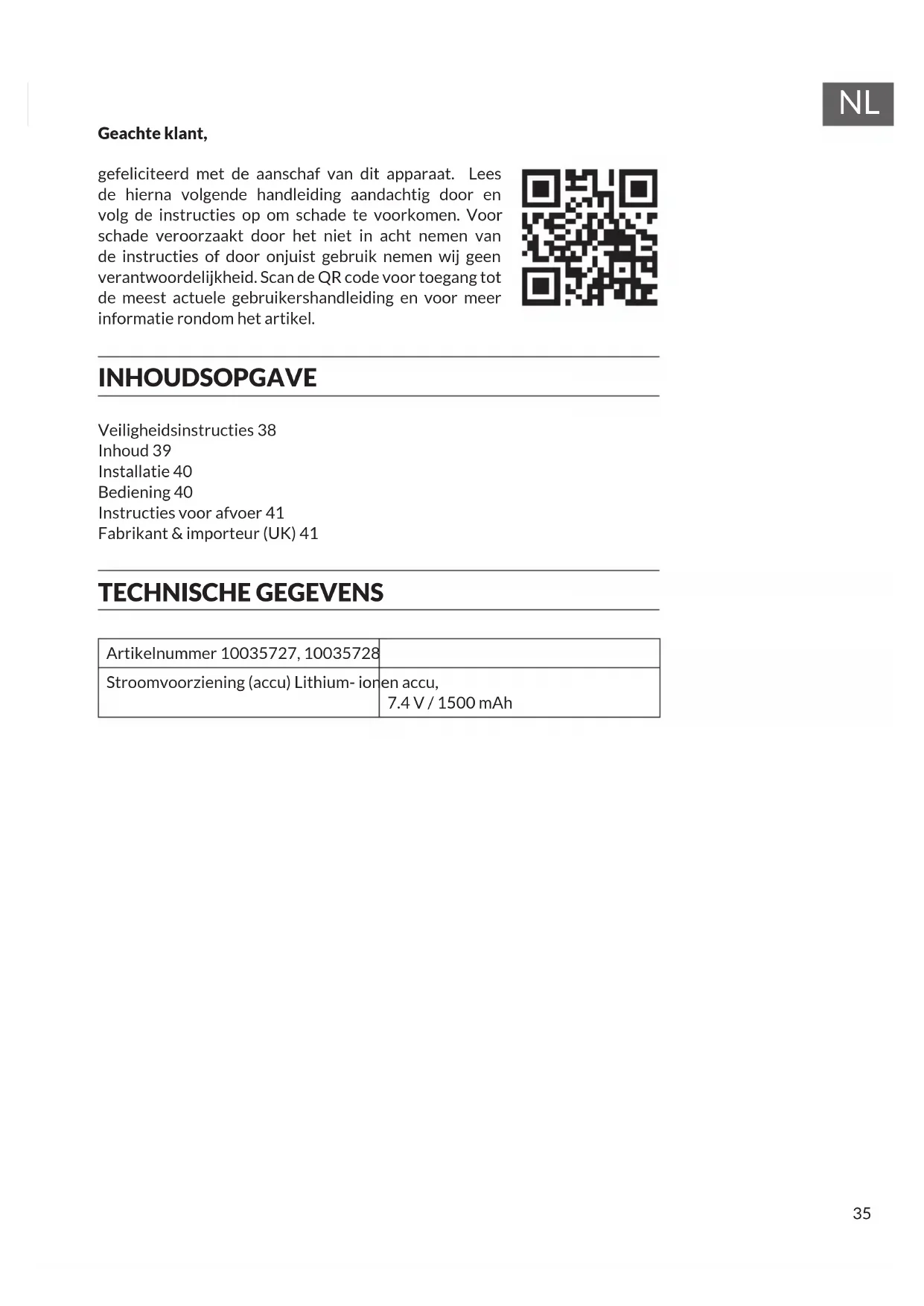Geachte klant, gefeliciteerd met de aanschaf van dit apparaat. Lees de hierna volgende handleiding aandachtig door en volg de instructies op om schade te voorkomen. Voor schade veroorzaakt door het niet in acht nemen van de instructies of door onjuist gebruik nemen wij geen verantwoordelijkheid. Scan de QR code voor toegang tot de meest actuele gebruikershandleiding en voor meer informatie rondom het artikel. INHOUDSOPGAVE Veiligheidsinstructies 38 Inhoud 39 Installatie 40 Bediening 40 Instructies voor afvoer 41 Fabrikant & importeur (UK) 41 TECHNISCHE GEGEVENS Artikelnummer 10035727, 10035728 Stroomvoorziening (accu) Lithium- ionen accu,