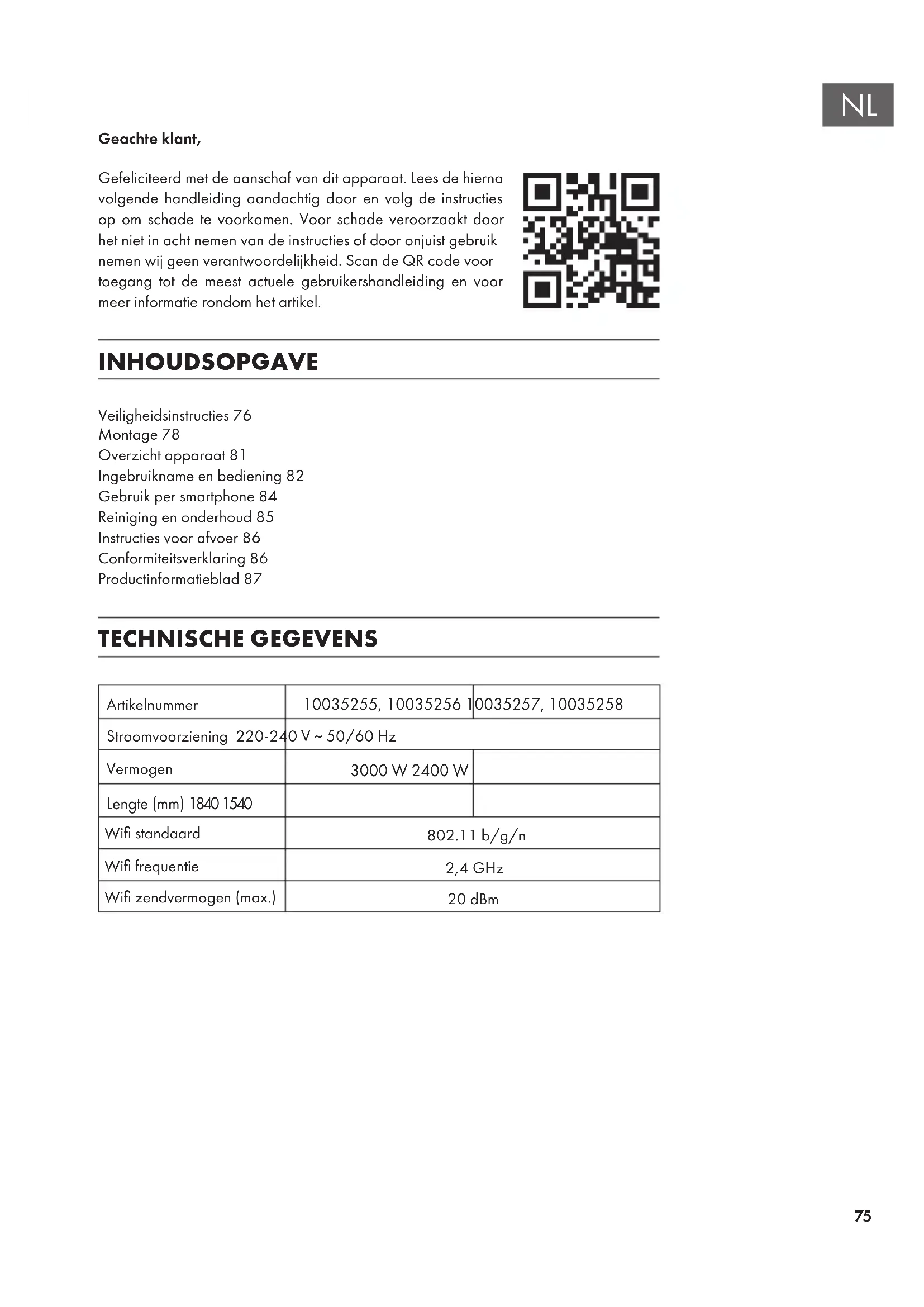 Geachte klant, Gefeliciteerd met de aanschaf van dit apparaat. Lees de hierna volgende handleiding aandachtig door en volg de instructies op om schade te voorkomen. Voor schade veroorzaakt door het niet in acht nemen van de instructies of door onjuist gebruik nemen wij geen verantwoordelijkheid. Scan de QR code voor toegang tot de meest actuele gebruikershandleiding en voor meer informatie rondom het artikel. INHOUDSOPGAVE Veiligheidsinstructies 76 Montage 78 Overzicht apparaat 81 Ingebruikname en bediening 82 Gebruik per smartphone 84 Reiniging en onderhoud 85 Instructies voor afvoer 86 Conformiteitsverklaring 86 Productinformatieblad 87 TECHNISCHE GEGEVENS Artikelnummer 10035255, 10035256 10035257, 10035258 Stroomvoorziening 220-240 V ~ 50/60 Hz Vermogen 3000 W 2400 W Lengte (mm) 1840 1540 Wi standaard