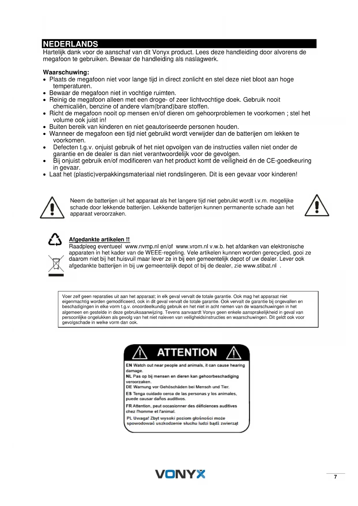 - Wanneer de megafoon een tijd niet gebruikt wordt verwijder dan de batterijen om lekken te voorkomen.