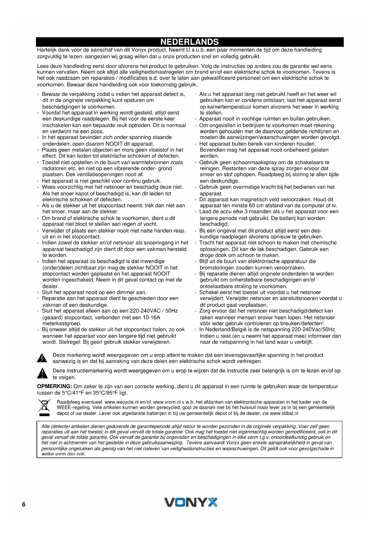 HOW TO CONNECT WITH YOUR BLUETOOTH DEVICE: First turn on the speaker, then press on “MODE” (D) till you see “AUX”. Then use your mobile or computer to search a Bluetooth device. When you find the “BT-STREAM” then connect. The password is: 00005 TROUBLESHOOTING One certain method of determining if a speaker is faulty is to substitute a speaker that is known to work correctly for the suspected problem speaker. If the “normally correct speaker” is experiencing the same difficulties or problems as the suspected problem speaker, use the information below to isolate the problem. Problem Possible cause Action No output Cables Reseat all connectors Substitute known good cables Check solder joins Inspect cable for damage Inspect wire or connector for stray strand that may short Intermittent Poor connections While it is possible for a faulty speaker to exhibit intermittent output, it’s more likely that an output cable/connector is the problem. Check the soldering on your connectors. Constant noise, buzzing and/or humming Faulty electronic Any constant noise originates in the amplifier, mixer, signal processing, source device in the signal devices, or line-level wiring. Check and correct system grounding as required. Chain check for noisy sources or electronic components. Check wiring for shielding. Poor low-frequency output Improper polarity When two speakers in close proximity to each other are connected out-of-polarity, they can partially cancel each other out, especially at low frequencies. Check your speaker cables to be sure they are all identically wired and connected. Check the balanced line signal cables to be sure they are all correctly wired.6 NEDERLANDS Hartelijk dank voor de aanschaf van dit Vonyx product. Neemt U a.u.b. een paar momenten de tijd om deze handleiding zorgvuldig te lezen, aangezien wij graag willen dat u onze producten snel en volledig gebruikt. Lees deze handleiding eerst door alvorens het product te gebruiken. Volg de instructies op anders zou de garantie wel eens kunnen vervallen. Neem ook altijd alle veiligheidsmaatregelen om brand en/of een elektrische schok te voorkomen. Tevens is het ook raadzaam om reparaties / modificaties e.d. over te laten aan gekwalificeerd personeel om een elektrische schok te voorkomen. Bewaar deze handleiding ook voor toekomstig gebruik. - Bewaar de verpakking zodat u indien het apparaat defect is, dit in de originele verpakking kunt opsturen om beschadigingen te voorkomen. - Voordat het apparaat in werking wordt gesteld, altijd eerst een deskundige raadplegen. Bij het voor de eerste keer inschakelen kan een bepaalde reuk optreden. Dit is normaal en verdwijnt na een poos. - In het apparaat bevinden zich onder spanning staande onderdelen; open daarom NOOIT dit apparaat. - Plaats geen metalen objecten en mors geen vloeistof in het effect. Dit kan leiden tot elektrische schokken of defecten. - Toestel niet opstellen in de buurt van warmtebronnen zoals radiatoren etc. en niet op een vibrerende onder- grond plaatsen. Dek ventilatieopeningen nooit af. - Het apparaat is niet geschikt voor continu gebruik. - Wees voorzichtig met het netsnoer en beschadig deze niet. Als het snoer kapot of beschadigd is, kan dit leiden tot elektrische schokken of defecten. - Als u de stekker uit het stopcontact neemt, trek dan niet aan het snoer, maar aan de stekker. - Om brand of elektrische schok te voorkomen, dient u dit apparaat niet bloot te stellen aan regen of vocht. - Verwijder of plaats een stekker nooit met natte handen resp. uit en in het stopcontact. - Indien zowel de stekker en/of netsnoer als snoeringang in het apparaat beschadigd zijn dient dit door een vakman hersteld te worden. - Indien het apparaat zo beschadigd is dat inwendige (onder)delen zichtbaar zijn mag de stekker NOOIT in het stopcontact worden geplaatst en het apparaat NOOIT worden ingeschakeld. Neem in dit geval contact op met de dealer. - Sluit het apparaat nooit op een dimmer aan. - Reparatie aan het apparaat dient te geschieden door een vakman of een deskundige. - Sluit het apparaat alleen aan op een 220-240VAC / 50Hz (geaard) stopcontact, verbonden met een 10-16A meterkastgroep. - Bij onweer altijd de stekker uit het stopcontact halen, zo ook wanneer het apparaat voor een langere tijd niet gebruikt wordt. Stelregel: Bij geen gebruik stekker verwijderen. - Als u het apparaat lang niet gebruikt heeft en het weer wil gebruiken kan er condens ontstaan; laat het apparaat eerst op kamertemperatuur komen alvorens het weer in werking te stellen. - Apparaat nooit in vochtige ruimten en buiten gebruiken. - Om ongevallen in bedrijven te voorkomen moet rekening worden gehouden met de daarvoor geldende richtlijnen en moeten de aanwijzingen/waarschuwingen worden gevolgd. - Het apparaat buiten bereik van kinderen houden. Bovendien mag het apparaat nooit onbeheerd gelaten worden. - Gebruik geen schoonmaakspray om de schakelaars te reinigen. Restanten van deze spray zorgen ervoor dat smeer en stof ophopen. Raadpleeg bij storing te allen tijde een deskundige. - Gebruik geen overmatige kracht bij het bedienen van het apparaat. - Dit apparaat kan magnetisch veld veroorzaken. Houd dit apparaat ten minste 60 cm afstand van de computer of tv. - Laad de accu elke 3 maanden als u het apparaat voor een langere periode niet gebruikt. De batterij kan worden beschadigd. - Bij een ongeval met dit product altijd eerst een des- kundige raadplegen alvorens opnieuw te gebruiken. - Tracht het apparaat niet schoon te maken met chemische oplossingen. Dit kan de lak beschadigen. Gebruik een droge doek om schoon te maken. - Blijf uit de buurt van elektronische apparatuur die bromstoringen zouden kunnen veroorzaken. - Bij reparatie dienen altijd originele onderdelen te worden gebruikt om onherstelbare beschadigingen en/of ontoelaatbare straling te voorkomen. - Schakel eerst het toestel uit voordat u het netsnoer verwijdert. Verwijder netsnoer en aansluitsnoeren voordat u dit product gaat verplaatsen. - Zor