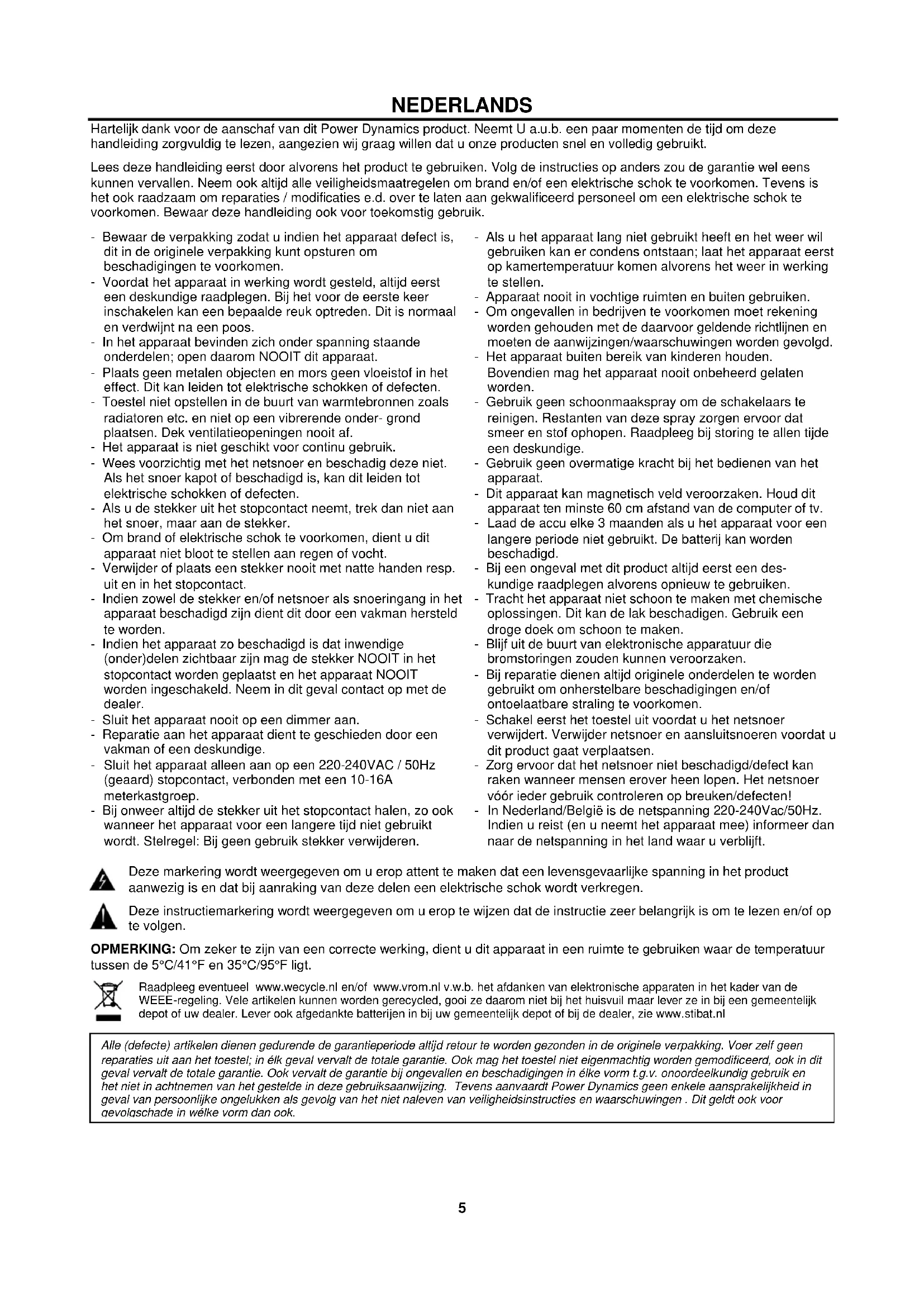 Displays the signal of output. NOTE: The "0" segment corresponds to the nominal output level. The peak indicator lights up red when the output reaches the clipping level.5 NEDERLANDS Hartelijk dank voor de aanschaf van dit Power Dynamics product. Neemt U a.u.b. een paar momenten de tijd om deze handleiding zorgvuldig te lezen, aangezien wij graag willen dat u onze producten snel en volledig gebruikt. Lees deze handleiding eerst door alvorens het product te gebruiken. Volg de instructies op anders zou de garantie wel eens kunnen vervallen. Neem ook altijd alle veiligheidsmaatregelen om brand en/of een elektrische schok te voorkomen. Tevens is het ook raadzaam om reparaties / modificaties e.d. over te laten aan gekwalificeerd personeel om een elektrische schok te voorkomen. Bewaar deze handleiding ook voor toekomstig gebruik. - Bewaar de verpakking zodat u indien het apparaat defect is, dit in de originele verpakking kunt opsturen om beschadigingen te voorkomen. - Voordat het apparaat in werking wordt gesteld, altijd eerst een deskundige raadplegen. Bij het voor de eerste keer inschakelen kan een bepaalde reuk optreden. Dit is normaal en verdwijnt na een poos. - In het apparaat bevinden zich onder spanning staande onderdelen; open daarom NOOIT dit apparaat. - Plaats geen metalen objecten en mors geen vloeistof in het effect. Dit kan leiden tot elektrische schokken of defecten. - Toestel niet opstellen in de buurt van warmtebronnen zoals radiatoren etc. en niet op een vibrerende onder- grond plaatsen. Dek ventilatieopeningen nooit af. - Het apparaat is niet geschikt voor continu gebruik. - Wees voorzichtig met het netsnoer en beschadig deze niet. Als het snoer kapot of beschadigd is, kan dit leiden tot elektrische schokken of defecten. - Als u de stekker uit het stopcontact neemt, trek dan niet aan het snoer, maar aan de stekker. - Om brand of elektrische schok te voorkomen, dient u dit apparaat niet bloot te stellen aan regen of vocht. - Verwijder of plaats een stekker nooit met natte handen resp. uit en in het stopcontact. - Indien zowel de stekker en/of netsnoer als snoeringang in het apparaat beschadigd zijn dient dit door een vakman hersteld te worden. - Indien het apparaat zo beschadigd is dat inwendige (onder)delen zichtbaar zijn mag de stekker NOOIT in het stopcontact worden geplaatst en het apparaat NOOIT worden ingeschakeld. Neem in dit geval contact op met de dealer. - Sluit het apparaat nooit op een dimmer aan. - Reparatie aan het apparaat dient te geschieden door een vakman of een deskundige. - Sluit het apparaat alleen aan op een 220-240VAC / 50Hz (geaard) stopcontact, verbonden met een 10-16A meterkastgroep. - Bij onweer altijd de stekker uit het stopcontact halen, zo ook wanneer het apparaat voor een langere tijd niet gebruikt wordt. Stelregel: Bij geen gebruik stekker verwijderen. - Als u het apparaat lang niet gebruikt heeft en het weer wil gebruiken kan er condens ontstaan; laat het apparaat eerst op kamertemperatuur komen alvorens het weer in werking te stellen. - Apparaat nooit in vochtige ruimten en buiten gebruiken. - Om ongevallen in bedrijven te voorkomen moet rekening worden gehouden met de daarvoor geldende richtlijnen en moeten de aanwijzingen/waarschuwingen worden gevolgd. - Het apparaat buiten bereik van kinderen houden. Bovendien mag het apparaat nooit onbeheerd gelaten worden. - Gebruik geen schoonmaakspray om de schakelaars te reinigen. Restanten van deze spray zorgen ervoor dat smeer en stof ophopen. Raadpleeg bij storing te allen tijde een deskundige. - Gebruik geen overmatige kracht bij het bedienen van het apparaat. - Dit apparaat kan magnetisch veld veroorzaken. Houd dit apparaat ten minste 60 cm afstand van de computer of tv. - Laad de accu elke 3 maanden als u het apparaat voor een langere periode niet gebruikt. De batterij kan worden beschadigd. - Bij een ongeval met dit product altijd eerst een des- kundige raadplegen alvorens opnieuw te gebruiken. - Tracht het apparaat niet schoon te maken met chemische oplossingen. Dit kan de lak beschadigen. Gebruik een droge doek om schoon te maken. - Blijf uit de buurt van elektronische apparatuur die bromstoringen zouden kunnen veroorzaken. - Bij reparatie dienen altijd originele onderdelen te worden gebruikt om onherstelbare beschadigingen en/of ontoelaatbare straling te voorkomen. - Schakel eerst het toestel uit voordat u het netsnoer verwijdert. Verwijder netsnoer en aansluitsnoeren voordat u dit product gaat verplaatsen. - Zorg ervoor dat het netsnoer niet beschadigd/defect kan raken wanneer mensen erover heen lopen. Het netsnoer vóór ieder gebruik controleren op breuken/defecten! - In Nederland/België is de netspanning 220-240Vac/50Hz. Indien u reist (en u neemt het apparaat mee) informeer dan naar de netspanning in het land waar u verblijft.
