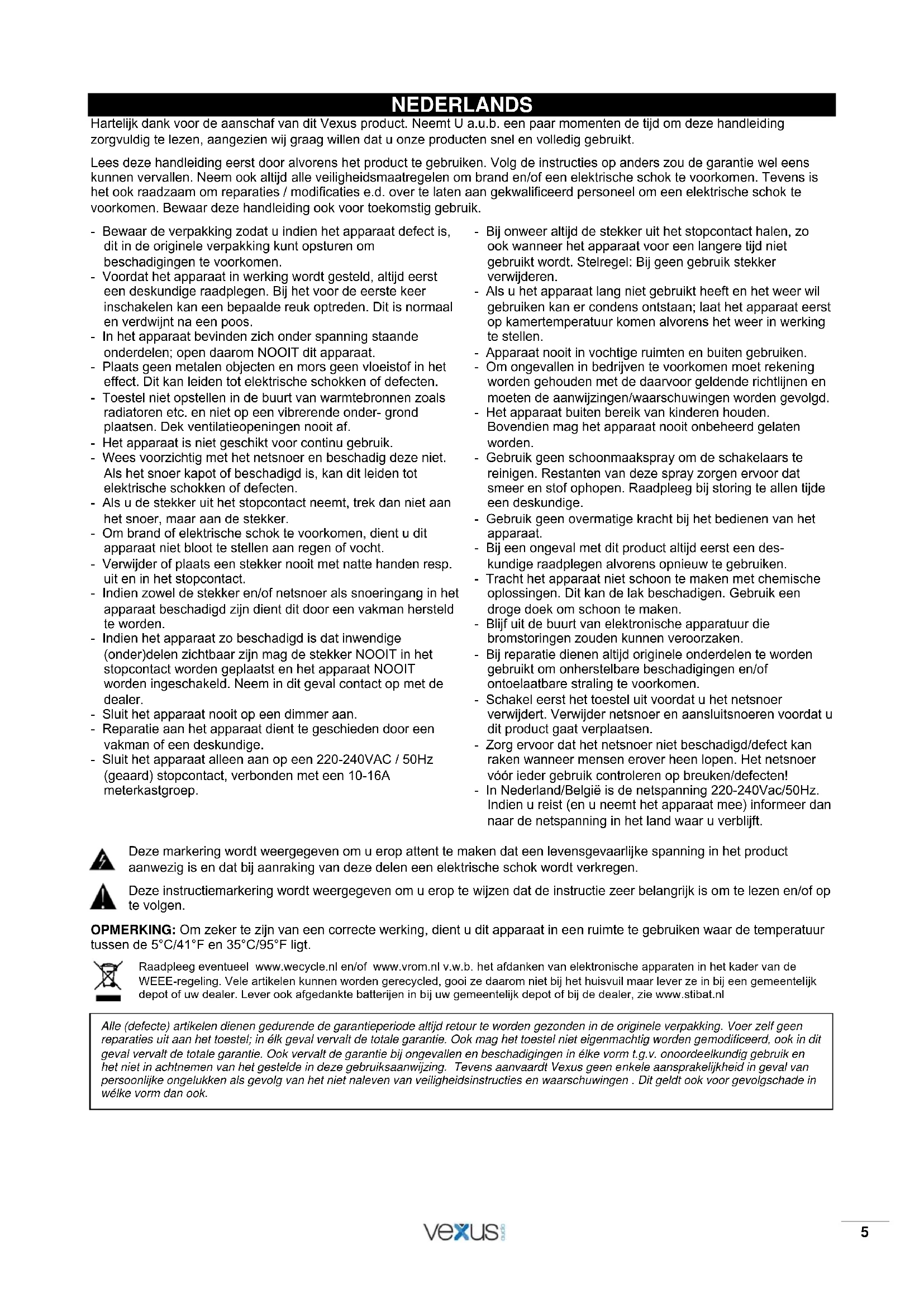 Connect the earth cable from the turntables. This helps to reduce humming and pop noise.5 NEDERLANDS Hartelijk dank voor de aanschaf van dit Vexus product. Neemt U a.u.b. een paar momenten de tijd om deze handleiding zorgvuldig te lezen, aangezien wij graag willen dat u onze producten snel en volledig gebruikt. Lees deze handleiding eerst door alvorens het product te gebruiken. Volg de instructies op anders zou de garantie wel eens kunnen vervallen. Neem ook altijd alle veiligheidsmaatregelen om brand en/of een elektrische schok te voorkomen. Tevens is het ook raadzaam om reparaties / modificaties e.d. over te laten aan gekwalificeerd personeel om een elektrische schok te voorkomen. Bewaar deze handleiding ook voor toekomstig gebruik. - Bewaar de verpakking zodat u indien het apparaat defect is, dit in de originele verpakking kunt opsturen om beschadigingen te voorkomen. - Voordat het apparaat in werking wordt gesteld, altijd eerst een deskundige raadplegen. Bij het voor de eerste keer inschakelen kan een bepaalde reuk optreden. Dit is normaal en verdwijnt na een poos. - In het apparaat bevinden zich onder spanning staande onderdelen; open daarom NOOIT dit apparaat. - Plaats geen metalen objecten en mors geen vloeistof in het effect. Dit kan leiden tot elektrische schokken of defecten. - Toestel niet opstellen in de buurt van warmtebronnen zoals radiatoren etc. en niet op een vibrerende onder- grond plaatsen. Dek ventilatieopeningen nooit af. - Het apparaat is niet geschikt voor continu gebruik. - Wees voorzichtig met het netsnoer en beschadig deze niet. Als het snoer kapot of beschadigd is, kan dit leiden tot elektrische schokken of defecten. - Als u de stekker uit het stopcontact neemt, trek dan niet aan het snoer, maar aan de stekker. - Om brand of elektrische schok te voorkomen, dient u dit apparaat niet bloot te stellen aan regen of vocht. - Verwijder of plaats een stekker nooit met natte handen resp. uit en in het stopcontact. - Indien zowel de stekker en/of netsnoer als snoeringang in het apparaat beschadigd zijn dient dit door een vakman hersteld te worden. - Indien het apparaat zo beschadigd is dat inwendige (onder)delen zichtbaar zijn mag de stekker NOOIT in het stopcontact worden geplaatst en het apparaat NOOIT worden ingeschakeld. Neem in dit geval contact op met de dealer. - Sluit het apparaat nooit op een dimmer aan. - Reparatie aan het apparaat dient te geschieden door een vakman of een deskundige. - Sluit het apparaat alleen aan op een 220-240VAC / 50Hz (geaard) stopcontact, verbonden met een 10-16A meterkastgroep. - Bij onweer altijd de stekker uit het stopcontact halen, zo ook wanneer het apparaat voor een langere tijd niet gebruikt wordt. Stelregel: Bij geen gebruik stekker verwijderen. - Als u het apparaat lang niet gebruikt heeft en het weer wil gebruiken kan er condens ontstaan; laat het apparaat eerst op kamertemperatuur komen alvorens het weer in werking te stellen. - Apparaat nooit in vochtige ruimten en buiten gebruiken. - Om ongevallen in bedrijven te voorkomen moet rekening worden gehouden met de daarvoor geldende richtlijnen en moeten de aanwijzingen/waarschuwingen worden gevolgd. - Het apparaat buiten bereik van kinderen houden. Bovendien mag het apparaat nooit onbeheerd gelaten worden. - Gebruik geen schoonmaakspray om de schakelaars te reinigen. Restanten van deze spray zorgen ervoor dat smeer en stof ophopen. Raadpleeg bij storing te allen tijde een deskundige. - Gebruik geen overmatige kracht bij het bedienen van het apparaat. - Bij een ongeval met dit product altijd eerst een des- kundige raadplegen alvorens opnieuw te gebruiken. - Tracht het apparaat niet schoon te maken met chemische oplossingen. Dit kan de lak beschadigen. Gebruik een droge doek om schoon te maken. - Blijf uit de buurt van elektronische apparatuur die bromstoringen zouden kunnen veroorzaken. - Bij reparatie dienen altijd originele onderdelen te worden gebruikt om onherstelbare beschadigingen en/of ontoelaatbare straling te voorkomen. - Schakel eerst het toestel uit voordat u het netsnoer verwijdert. Verwijder netsnoer en aansluitsnoeren voordat u dit product gaat verplaatsen. - Zorg ervoor dat het netsnoer niet beschadigd/defect kan raken wanneer mensen erover heen lopen. Het netsnoer vóór ieder gebruik controleren op breuken/defecten! - In Nederland/België is de netspanning 220-240Vac/50Hz. Indien u reist (en u neemt het apparaat mee) informeer dan naar de netspanning in het land waar u verblijft.