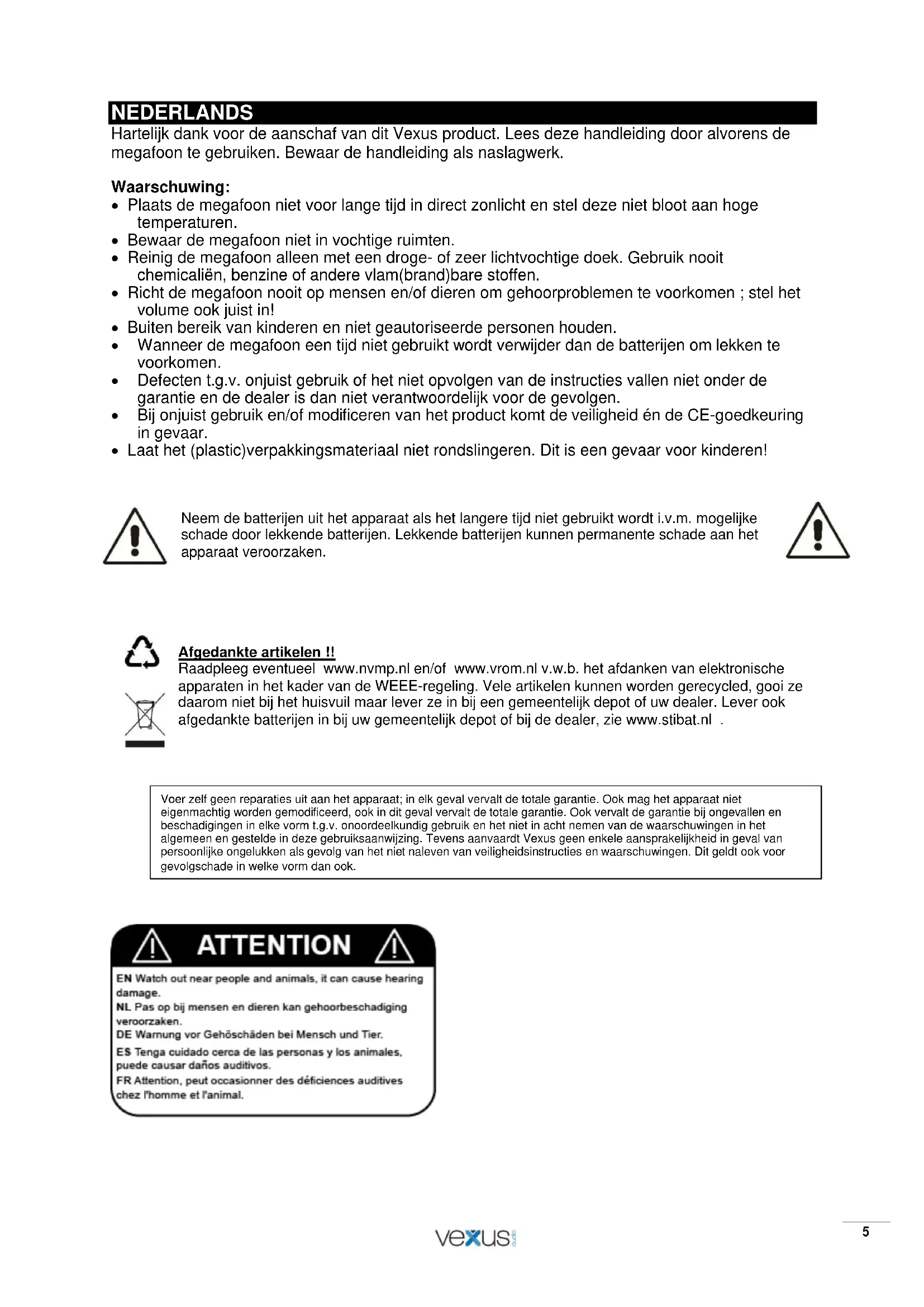 TECHNICAL SPECIFICATION Power max. : 55Watt Range : outdoor up to 700-1000m Battery : 8pcs Type C-Battery Battery lifetime : permanent use up to 5 hours Dimensions : Horn Ø230mm, Length 340mm Weight (without battery) : 1.3Kg The specifications are typical. The actual values can slightly change from one unit to the other. Specifications can be changed without prior notice.5 NEDERLANDS Hartelijk dank voor de aanschaf van dit Vexus product. Lees deze handleiding door alvorens de megafoon te gebruiken. Bewaar de handleiding als naslagwerk. Waarschuwing: Plaats de megafoon niet voor lange tijd in direct zonlicht en stel deze niet bloot aan hoge temperaturen. Bewaar de megafoon niet in vochtige ruimten. Reinig de megafoon alleen met een droge- of zeer lichtvochtige doek. Gebruik nooit chemicaliën, benzine of andere vlam(brand)bare stoffen. Richt de megafoon nooit op mensen en/of dieren om gehoorproblemen te voorkomen ; stel het volume ook juist in! Buiten bereik van kinderen en niet geautoriseerde personen houden. Wanneer de megafoon een tijd niet gebruikt wordt verwijder dan de batterijen om lekken te voorkomen. Defecten t.g.v. onjuist gebruik of het niet opvolgen van de instructies vallen niet onder de garantie en de dealer is dan niet verantwoordelijk voor de gevolgen. Bij onjuist gebruik en/of modificeren van het product komt de veiligheid én de CE-goedkeuring in gevaar. Laat het (plastic)verpakkingsmateriaal niet rondslingeren. Dit is een gevaar voor kinderen!
