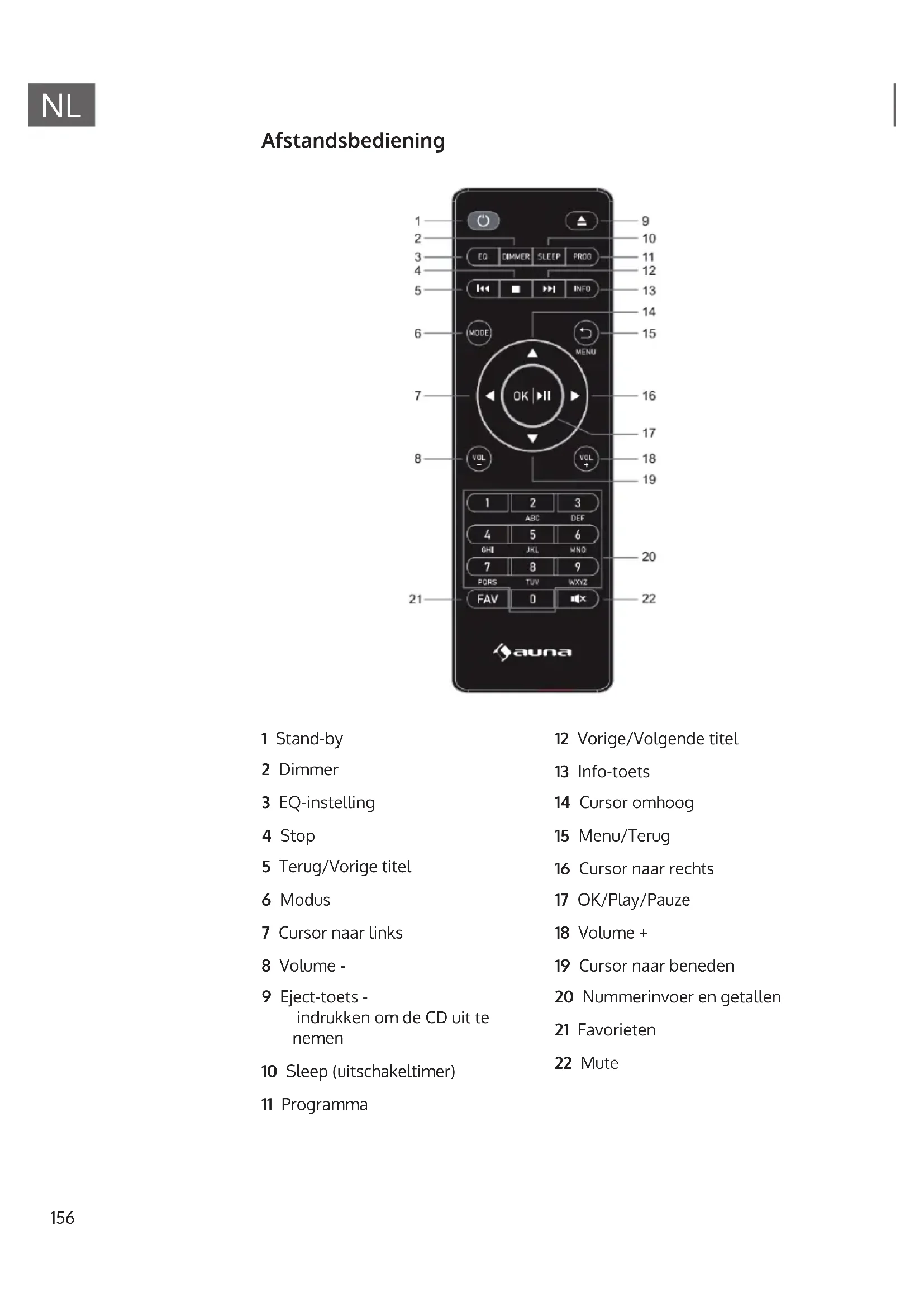 Afstandsbediening 1 Stand-by 2 Dimmer 3 EQ-instelling 4 Stop 5 Terug/Vorige titel 6 Modus 7 Cursor naar links 8 Volume - 9 Eject-toets - indrukken om de CD uit te nemen 10 Sleep (uitschakeltimer) 11 Programma 12 Vorige/Volgende titel 13 Info-toets 14 Cursor omhoog 15 Menu/Terug 16 Cursor naar rechts 17 OK/Play/Pauze 18 Volume + 19 Cursor naar beneden 20 Nummerinvoer en getallen 21 Favorieten 22 Mute157