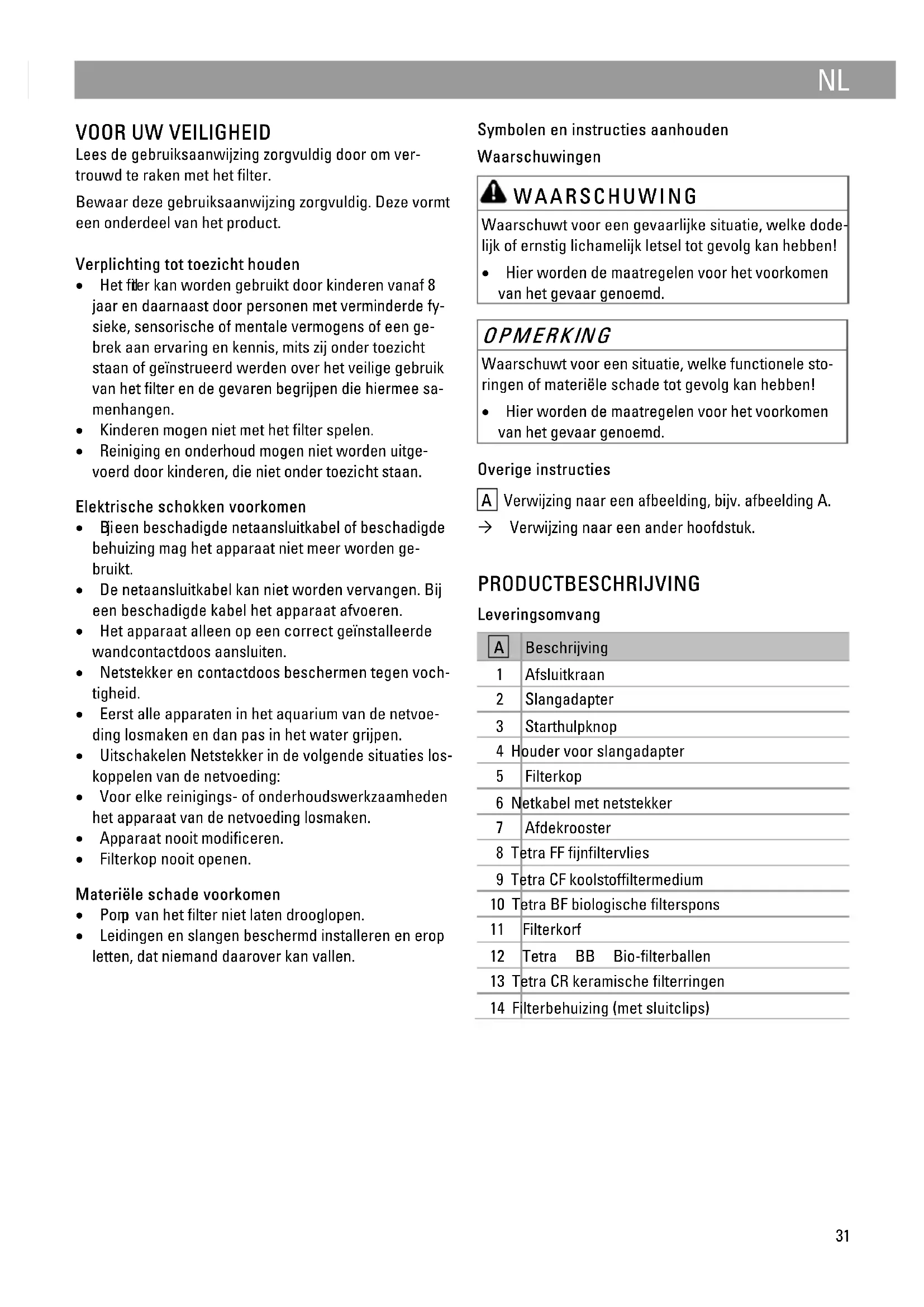 Beschrijving 1 Afsluitkraan 2 Slangadapter 3 Starthulpknop 4 Houder voor slangadapter 5 Filterkop 6 Netkabel met netstekker 7 Afdekrooster 8 Tetra FF fijnfiltervlies 9 Tetra CF koolstoffiltermedium 10 Tetra BF biologische filterspons 11 Filterkorf 12 Tetra BB Bio-filterballen 13 Tetra CR keramische filterringen 14 Filterbehuizing (met sluitclips)NL