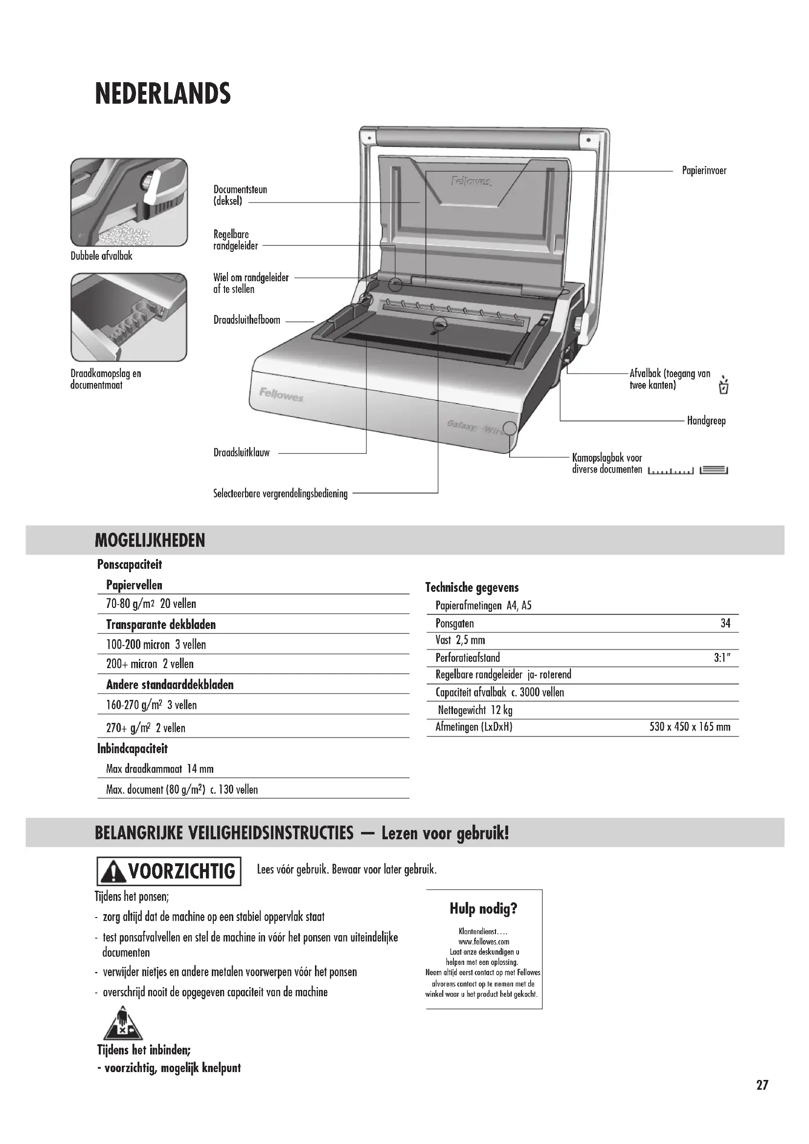 ITALIANOGalaxy Wire MOGELIJKHEDEN BELANGRIJKE VEILIGHEIDSINSTRUCTIES — Lezen voor gebruik! Tijdens het ponsen; - zorg altijd dat de machine op een stabiel oppervlak staat - test ponsafvalvellen en stel de machine in vóór het ponsen van uiteindelijke documenten - verwijder nietjes en andere metalen voorwerpen vóór het ponsen - overschrijd nooit de opgegeven capaciteit van de machine VOORZICHTIG Ponscapaciteit Papiervellen 70-80 g/m