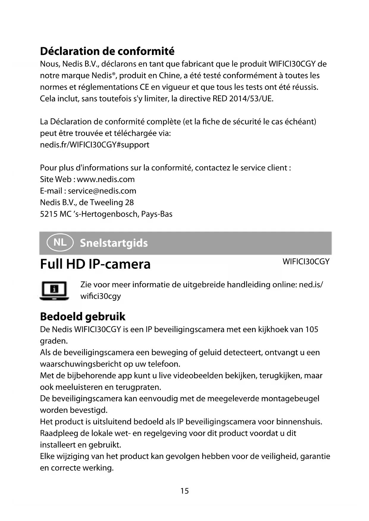- Plaats de camera op een afstand van minstens 1 meter van draadloze apparaten, waaronder Wi-Fi-routers en telefoons, om interferentie van andere draadloze apparaten te voorkomen. Conformiteitsverklaring Wij, Nedis B.V., verklaren als fabrikant dat het product WIFICI30CGY van ons merk Nedis®, geproduceerd in China, is getest conform alle relevante CE-normen en -voorschriften en dat alle tests met succes zijn doorstaan. Dit omvat, maar is niet beperkt tot de richtlijn RED 2014/53/EU. De volledige conformiteitsverklaring (en het blad met veiligheidsgegevens indien van toepassing) kan worden gevonden en gedownload via nedis.nl/WIFICI30CGY#support WIFICI30CGY_MAN_COMP_0820_print_(20452 1422)_v01.indd 18WIFICI30CGY_MAN_COMP_0820_print_(20452 1422)_v01.indd 18 16-9-2020 09:39:2116-9-2020 09:39:2119 Voor andere informatie met betrekking tot de naleving neemt u contact op met de klantenservice: Web: www.nedis.nl E-mail: service@nedis.com Nedis B.V., de Tweeling 28 5215 MC ’s-Hertogenbosch, Nederland