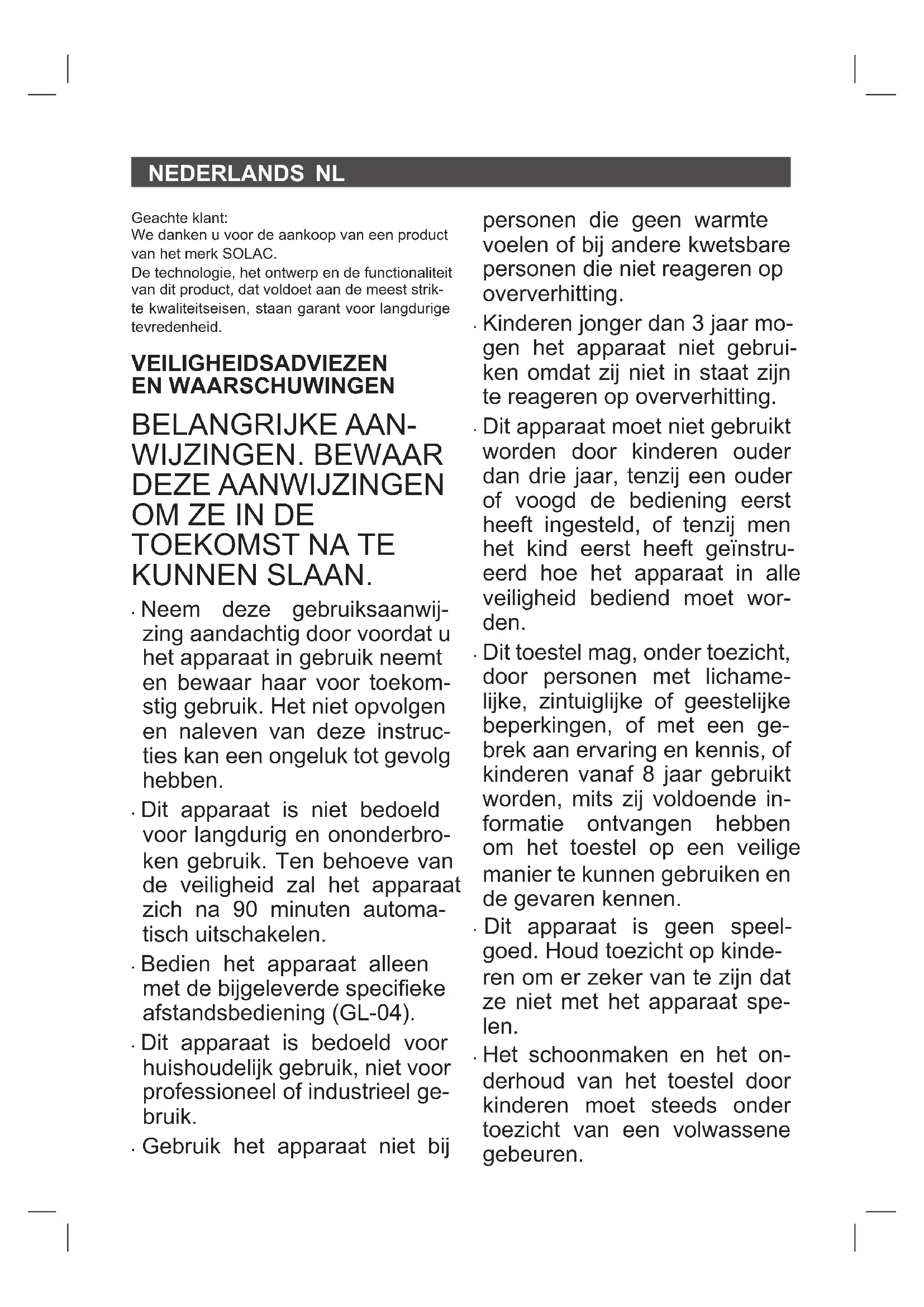 - Dit apparaat is niet bedoeld voor langdurig en ononderbro- ken gebruik. Ten behoeve van de veiligheid zal het apparaat zich na 90 minuten automa- tisch uitschakelen.