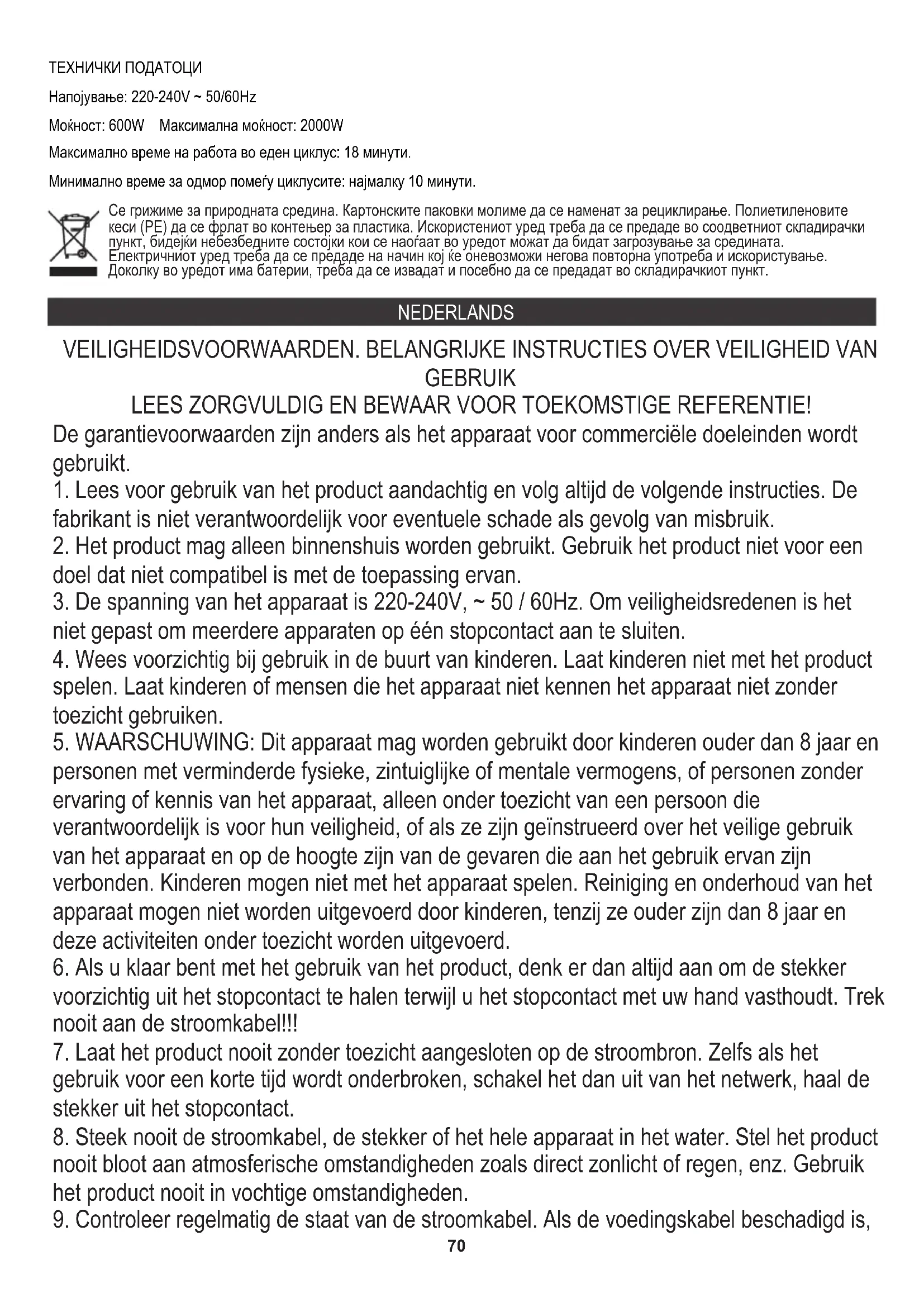 TECHNISCHE DATA Voeding: 220-240V ~50/60Hz Vermogen: 600W Maximaal vermogen: 2000 W Maximale bedrijfstijd in één cyclus: 18 minuten. Minimale rusttijd tussen cycli: minimaal 10 minuten.74