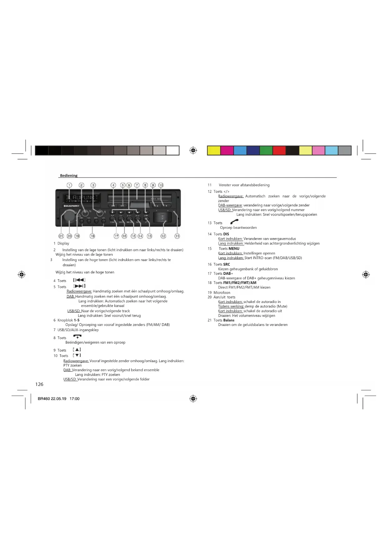 1 Display 2 Instelling van de lage tonen (licht indrukken om naar links/rechts te draaien) Wijzig het niveau van de lage tonen 3 Instelling van de hoge tonen (licht indrukken om naar links/rechts te draaien) Wijzig het niveau van de hoge tonen 4 Toets 5 Toets Radioweergave: Handmatig zoeken met één schaalpunt omhoog/omlaag. DAB: Handmatig zoeken met één schaalpunt omhoog/omlaag. Lang indrukken: Automatisch zoeken naar het volgende ensemble/gebruikte kanaal USB/SD: Naar de vorige/volgende track Lang indrukken: Snel vooruit/snel terug 6 Knopblok 1-5 Opslag/ Oproeping van vooraf ingestelde zenders (FM/AM/ DAB) 7 USB/SD/AUX-ingangsklep 8 Toets Beëindigen/weigeren van een oproep 9 Toets 10 Toets Radioweergave: Vooraf ingestelde zender omhoog/omlaag. Lang indrukken: PTY zoeken DAB: Verandering naar een vorig/volgend bekend ensemble Lang indrukken: PTY zoeken USB/SD: Verandering naar een vorige/volgende folder 11 Venster voor afstandsbediening 12 Toets </> Radioweergave: Automatisch zoeken naar de vorige/volgende zender DAB-weergave: verandering naar vorige/volgende zender USB/SD: Verandering naar een vorig/volgend nummer Lang indrukken: Snel vooruitspoelen/terugspoelen 13 Toets Oproep beantwoorden 14 Toets DIS Kort indrukken: Veranderen van weergavemodus Lang indrukken: Helderheid van achtergrondverlichting wijzigen 15 Toets ME NU Kort indrukken: Instellingen openen Lang indrukken: Start INTRO-scan (FM/DAB/USB/SD) 16 Toets SRC Kiezen geheugenbank of geluidsbron 17 Toets DAB+ DAB-weergave of DAB+ geheugenniveau kiezen 18 Toets FM1/FM2/FMT/AM Direct FM1/FM2/FMT/AM kiezen 19 Microfoon 20 Aan/uit toets Kort indrukken: schakel de autoradio in Tijdens werking: demp de autoradio (Mute) Kort indrukken: schakel de autoradio uit Draaien: Het volumeniveau wijzigen 21 Toets Balans Draaien om de geluidsbalans te veranderenBR460 22.05.19 17:00 AUTORADIO