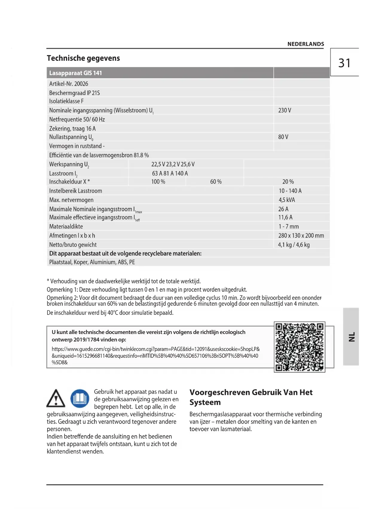 Voorgeschreven Gebruik Van Het Systeem Beschermgaslasapparaat voor thermische verbinding van ijzer – metalen door smelting van de kanten en toevoer van lasmateriaal. Gebruik het apparaat pas nadat u de gebruiksaanwijzing gelezen en begrepen hebt. Let op alle, in de gebruiksaanwijzing aangegeven, veiligheidsinstruc- ties. Gedraagt u zich verantwoord tegenover andere personen. Indien betreende de aansluiting en het bedienen van het apparaat twijfels ontstaan, kunt u zich tot de klantendienst wenden. NEDERLANDS Technische gegevens Lasapparaat GIS 141 Artikel-Nr. 20026 Beschermgraad IP 21S Isolatieklasse F Nominale ingangsspanning (Wisselstroom) U