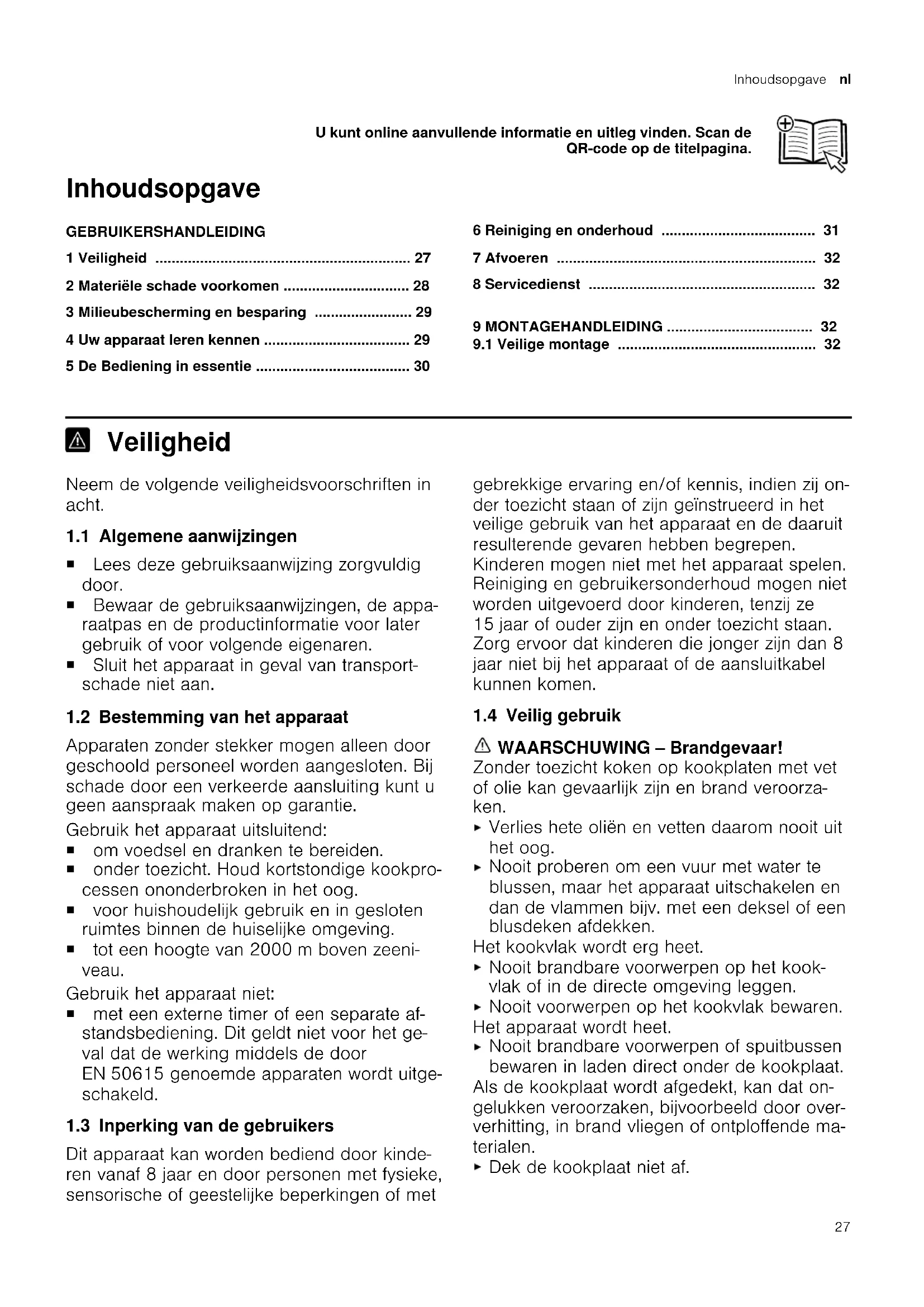 Veiligheid 1 Veiligheid Neem de volgende veiligheidsvoorschriften in acht. 1.1 Algemene aanwijzingen ¡ Lees deze gebruiksaanwijzing zorgvuldig door. ¡ Bewaar de gebruiksaanwijzingen, de appa- raatpas en de productinformatie voor later gebruik of voor volgende eigenaren. ¡ Sluit het apparaat in geval van transport- schade niet aan. 1.2 Bestemming van het apparaat Apparaten zonder stekker mogen alleen door geschoold personeel worden aangesloten. Bij schade door een verkeerde aansluiting kunt u geen aanspraak maken op garantie. Gebruik het apparaat uitsluitend: ¡ om voedsel en dranken te bereiden. ¡ onder toezicht. Houd kortstondige kookpro- cessen ononderbroken in het oog. ¡ voor huishoudelijk gebruik en in gesloten ruimtes binnen de huiselijke omgeving. ¡ tot een hoogte van 2000m boven zeeni- veau. Gebruik het apparaat niet: ¡ met een externe timer of een separate af- standsbediening. Dit geldt niet voor het ge- val dat de werking middels de door EN50615 genoemde apparaten wordt uitge- schakeld. 1.3 Inperking van de gebruikers Dit apparaat kan worden bediend door kinde- ren vanaf 8 jaar en door personen met fysieke, sensorische of geestelijke beperkingen of met gebrekkige ervaring en/of kennis, indien zij on- der toezicht staan of zijn geïnstrueerd in het veilige gebruik van het apparaat en de daaruit resulterende gevaren hebben begrepen. Kinderen mogen niet met het apparaat spelen. Reiniging en gebruikersonderhoud mogen niet worden uitgevoerd door kinderen, tenzij ze 15jaar of ouder zijn en onder toezicht staan. Zorg ervoor dat kinderen die jonger zijn dan 8 jaar niet bij het apparaat of de aansluitkabel kunnen komen. 1.4 Veilig gebruik WAARSCHUWING‒Brandgevaar! Zonder toezicht koken op kookplaten met vet of olie kan gevaarlijk zijn en brand veroorza- ken. Verlies hete oliën en vetten daarom nooit uit het oog. Nooit proberen om een vuur met water te blussen, maar het apparaat uitschakelen en dan de vlammen bijv. met een deksel of een blusdeken afdekken. Het kookvlak wordt erg heet. Nooit brandbare voorwerpen op het kook- vlak of in de directe omgeving leggen. Nooit voorwerpen op het kookvlak bewaren. Het apparaat wordt heet. Nooit brandbare voorwerpen of spuitbussen bewaren in laden direct onder de kookplaat. Als de kookplaat wordt afgedekt, kan dat on- gelukken veroorzaken, bijvoorbeeld door over- verhitting, in brand vliegen of ontploffende ma- terialen. Dek de kookplaat niet af. 27nl Materiële schade voorkomen Levensmiddelen kunnen vuur vatten. Er moet toezicht worden gehouden op het kookproces. Een korte procedure moet per- manent worden gecontroleerd. WAARSCHUWING‒Kans op brandwon- den! Tijdens het gebruik worden het apparaat en zijn aanraakbare onderdelen heet, vooral een eventueel aanwezig kookplaatframe. Wees voorzichtig om het aanraken van ver- warmingselementen te voorkomen. Kinderen jonger dan 8 jaar moeten uit de buurt worden gehouden. Kookplaatbeschermroosters kunnen tot onge- vallen leiden. Nooit kookplaatbeschermroosters gebruiken. Het apparaat wordt heet tijdens het gebruik. Het apparaat voor het schoonmaken laten afkoelen. De grepen van het kookgerei kunnen tijdens het gebruik heet worden. Als de grepen boven de verwarmingszone komen te liggen, kunnen de grepen bijzonder heet worden. Altijd de volledige verwarmingszone met het kookgereik afdekken. Een pannenlap gebruiken. WAARSCHUWING‒Kans op elektrische schok! Ondeskundige reparaties zijn gevaarlijk. Alleen daarvoor geschoold vakpersoneel mag reparaties aan het apparaat uitvoeren. Er mogen uitsluitend originele reserveonder- delen worden gebruikt voor reparatie van het apparaat. Wanneer de netaansluitkabel of de apparaat- aansluitkabel van dit apparaat beschadigd raakt, moet deze worden vervangen door een speciale netaansluitkabel of speciale ap- paraataansluitkabel die verkrijgbaar is bij de fabrikant of de klantenservice. Als het netsnoer van dit apparaat wordt be- schadigd, moet het door geschoold vakper- soneel worden vervangen. Een beschadigd apparaat is gevaarlijk. Nooit een beschadigd apparaat gebruiken. Is het oppervlak gescheurd, dan het appa- raat uitschakelen om een mogelijke elektri- sche schok te vermijden. Hiervoor het appa- raat via de zekering in de meterkast uitscha- kelen. Kookzoneknop op nul zetten. Neem contact op met de service-afdeling. Alleen daarvoor geschoold vakpersoneel mag reparaties aan het apparaat uitvoeren. Binnendringend vocht kan een elektrische schok veroorzaken. Geen stoomreiniger of hogedrukreiniger ge- bruiken om het apparaat te reinigen. Bij hete apparaatonderdelen kan de kabeliso- latie van elektrische apparaten smelten. Zorg ervoor dat de aansluitkabel van elektri- sche apparaten nooit in contact komt met hete onderdelen van het apparaat. WAARSCHUWING‒Kans op letsel! Wanneer er vloeistof zit tussen de bodem van de pan en de kookzone, kunnen kookpannen plotseling omhoog springen. Zorg ervoor dat de kookzone en de bodem van de pan altijd droog zijn. WAARSCHUWING‒Kans op verstikking! Kinderen kunnen verpakkingsmateriaal over het hoofd trekken en hierin verstrikt raken en stikken. Verpakkingsmateriaal uit de buurt van kinde- ren houden. Laat kinderen niet met verpakkingsmateriaal spelen. Kinderen kunnen kleine onderdelen inademen of inslikken en hierdoor stikken. Kleine onderdelen uit de buurt van kinderen houden. Kinderen niet met kleine onderdelen laten spelen. Materiële schade voorkomen2 Materiële schade voorkomen LET OP Door ruwe bodems van pannen ontstaan krassen op de glaskeramiek. Kookgerei controleren. Door droogkoken kan het kookgerei of het apparaat be- schadigd raken. Nooit pannen zonder inhoud op een hete kookzone zetten of laten droogkoken. Verkeerd geplaatst kookgerei kan tot oververhitting van het apparaat leiden. Nooit hete kook- of bakpannen op de bedieningsele- menten of de kookplaatrand zetten. Wanneer er harde en puntige voorwerpen op de kook- plaat vallen, kan deze beschadigd raken. Geen harde of puntige voorwerpen op de kookplaat laten val