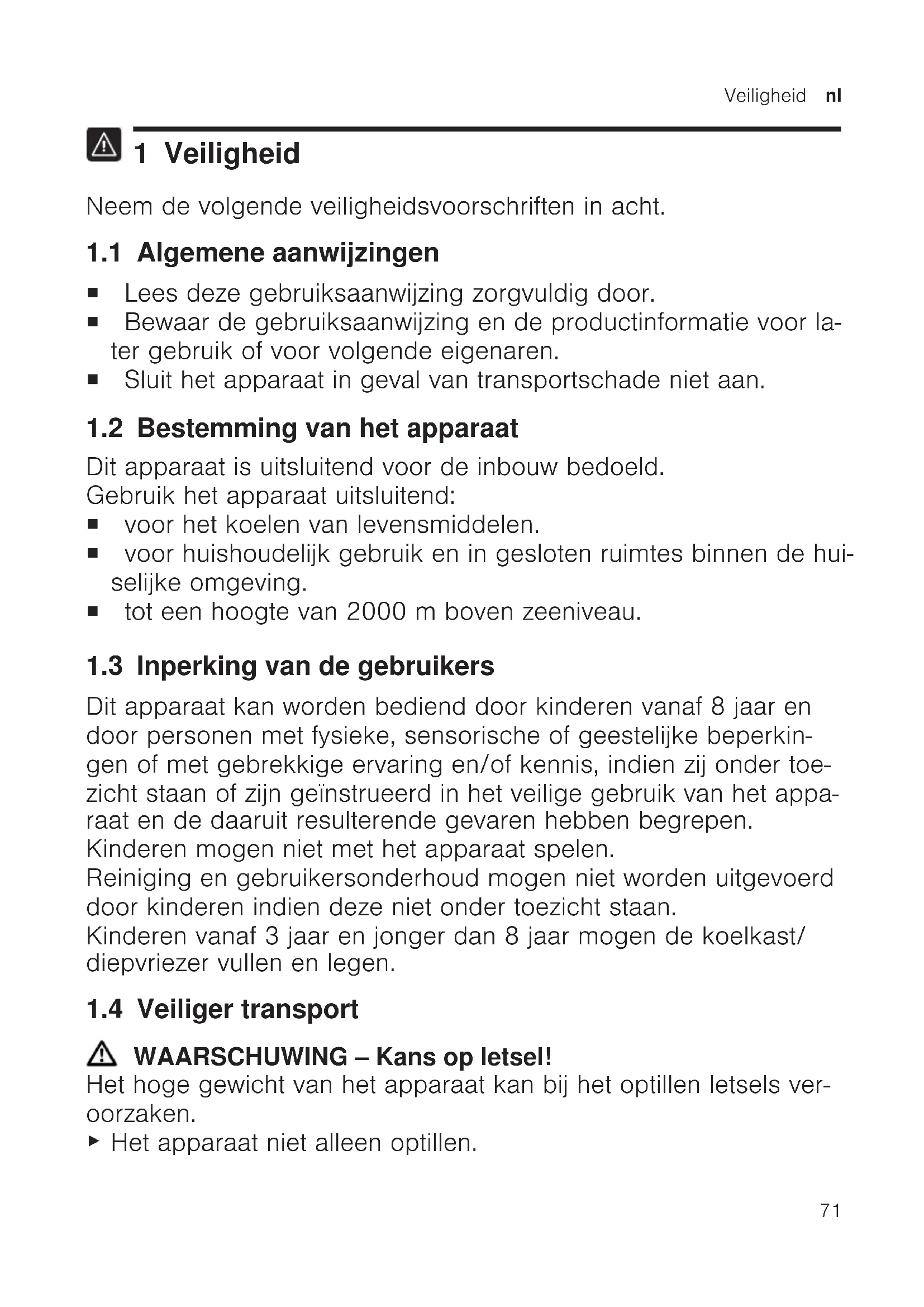 1 Veiligheid Neem de volgende veiligheidsvoorschriften in acht. 1.1 Algemene aanwijzingen ¡ Lees deze gebruiksaanwijzing zorgvuldig door. ¡ Bewaar de gebruiksaanwijzing en de productinformatie voor la- ter gebruik of voor volgende eigenaren. ¡ Sluit het apparaat in geval van transportschade niet aan. 1.2 Bestemming van het apparaat Dit apparaat is uitsluitend voor de inbouw bedoeld. Gebruik het apparaat uitsluitend: ¡ voor het koelen van levensmiddelen. ¡ voor huishoudelijk gebruik en in gesloten ruimtes binnen de hui- selijke omgeving. ¡ tot een hoogte van 2000m boven zeeniveau. 1.3 Inperking van de gebruikers Dit apparaat kan worden bediend door kinderen vanaf 8 jaar en door personen met fysieke, sensorische of geestelijke beperkin- gen of met gebrekkige ervaring en/of kennis, indien zij onder toe- zicht staan of zijn geïnstrueerd in het veilige gebruik van het appa- raat en de daaruit resulterende gevaren hebben begrepen. Kinderen mogen niet met het apparaat spelen. Reiniging en gebruikersonderhoud mogen niet worden uitgevoerd door kinderen indien deze niet onder toezicht staan. Kinderen vanaf 3 jaar en jonger dan 8 jaar mogen de koelkast/ diepvriezer vullen en legen. 1.4 Veiliger transport WAARSCHUWING‒Kans op letsel! Het hoge gewicht van het apparaat kan bij het optillen letsels ver- oorzaken.