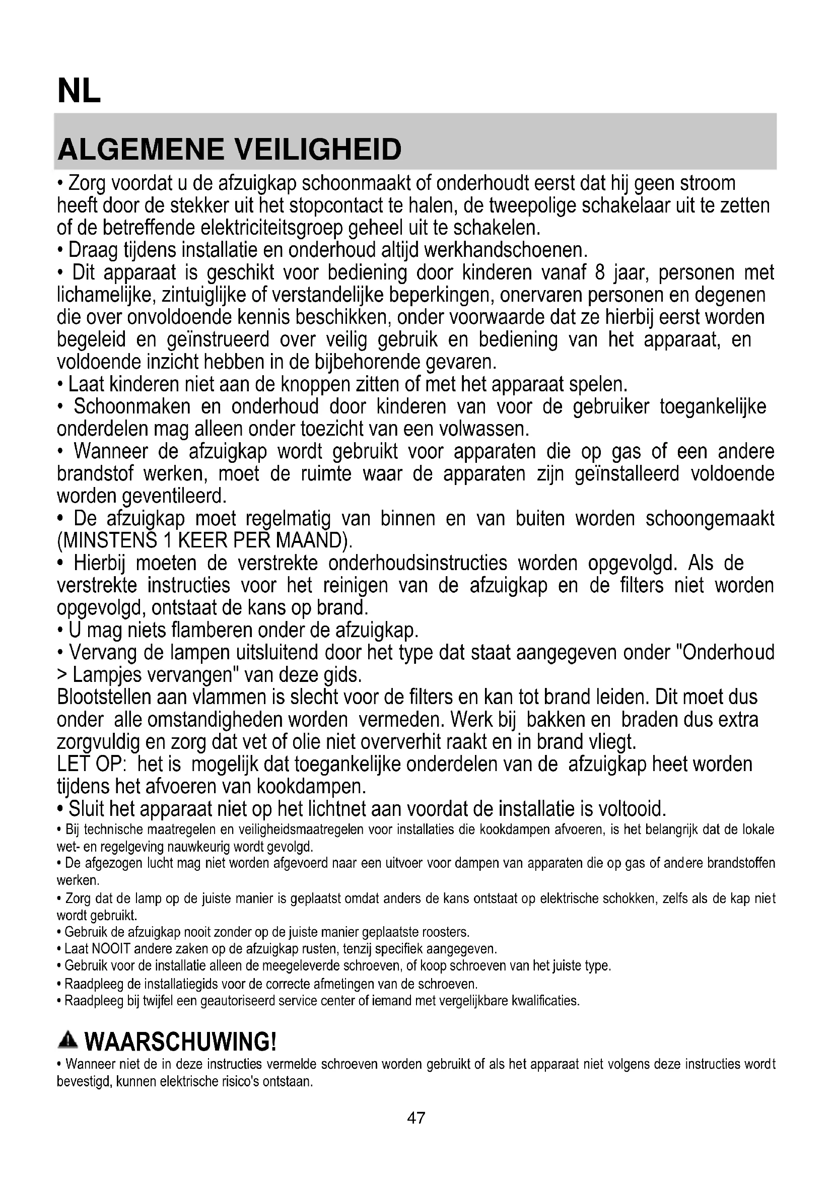 - Hierbij moeten de verstrekte onderhoudsinstructies worden opgevolgd. Als de verstrekte instructies voor het reinigen van de afzuigkap en de filters niet worden opgevolgd, ontstaat de kans op brand.