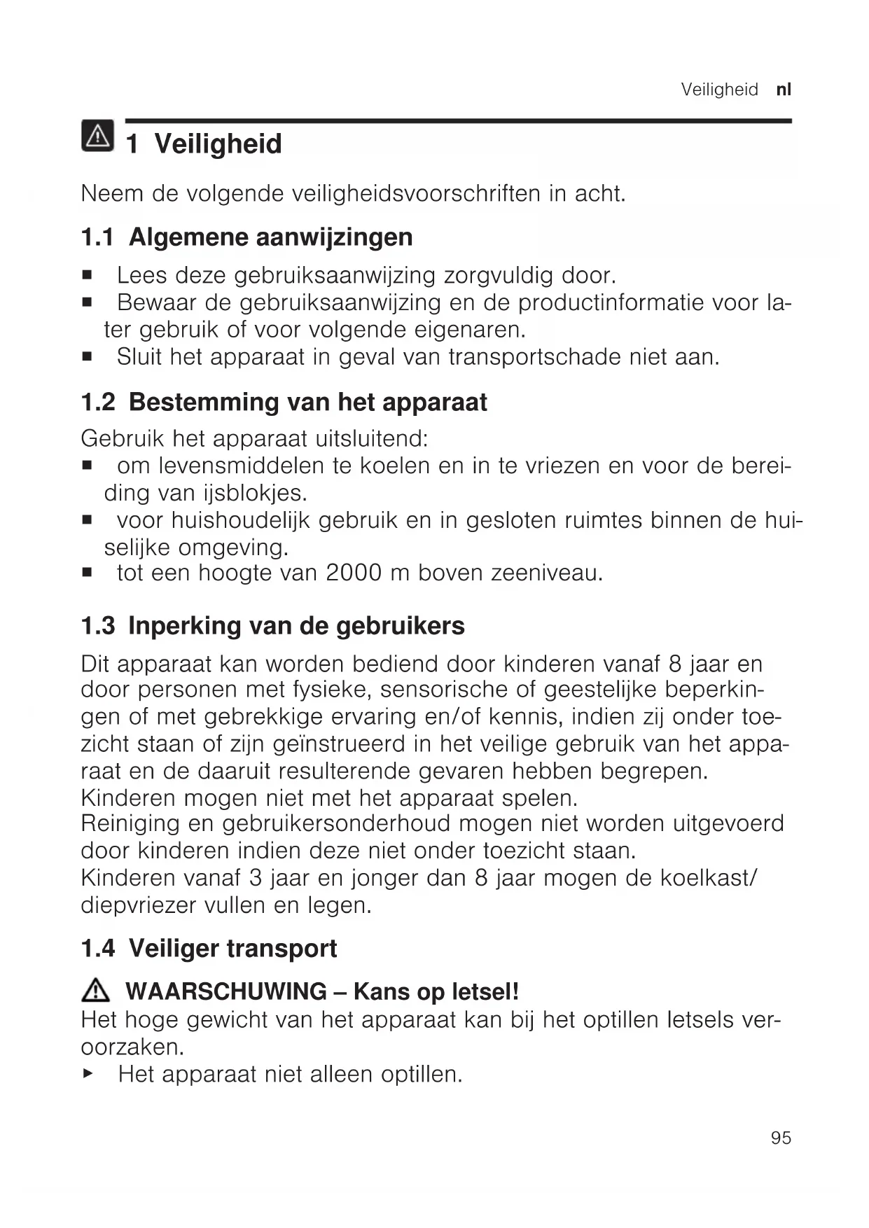 1 Veiligheid Neem de volgende veiligheidsvoorschriften in acht. 1.1 Algemene aanwijzingen ¡ Lees deze gebruiksaanwijzing zorgvuldig door. ¡ Bewaar de gebruiksaanwijzing en de productinformatie voor la- ter gebruik of voor volgende eigenaren. ¡ Sluit het apparaat in geval van transportschade niet aan. 1.2 Bestemming van het apparaat Gebruik het apparaat uitsluitend: ¡ om levensmiddelen te koelen en in te vriezen en voor de berei- ding van ijsblokjes. ¡ voor huishoudelijk gebruik en in gesloten ruimtes binnen de hui- selijke omgeving. ¡ tot een hoogte van 2000m boven zeeniveau. 1.3 Inperking van de gebruikers Dit apparaat kan worden bediend door kinderen vanaf 8 jaar en door personen met fysieke, sensorische of geestelijke beperkin- gen of met gebrekkige ervaring en/of kennis, indien zij onder toe- zicht staan of zijn geïnstrueerd in het veilige gebruik van het appa- raat en de daaruit resulterende gevaren hebben begrepen. Kinderen mogen niet met het apparaat spelen. Reiniging en gebruikersonderhoud mogen niet worden uitgevoerd door kinderen indien deze niet onder toezicht staan. Kinderen vanaf 3 jaar en jonger dan 8 jaar mogen de koelkast/ diepvriezer vullen en legen. 1.4 Veiliger transport WAARSCHUWING‒Kans op letsel! Het hoge gewicht van het apparaat kan bij het optillen letsels ver- oorzaken. ▶ Het apparaat niet alleen optillen.nl Veiligheid