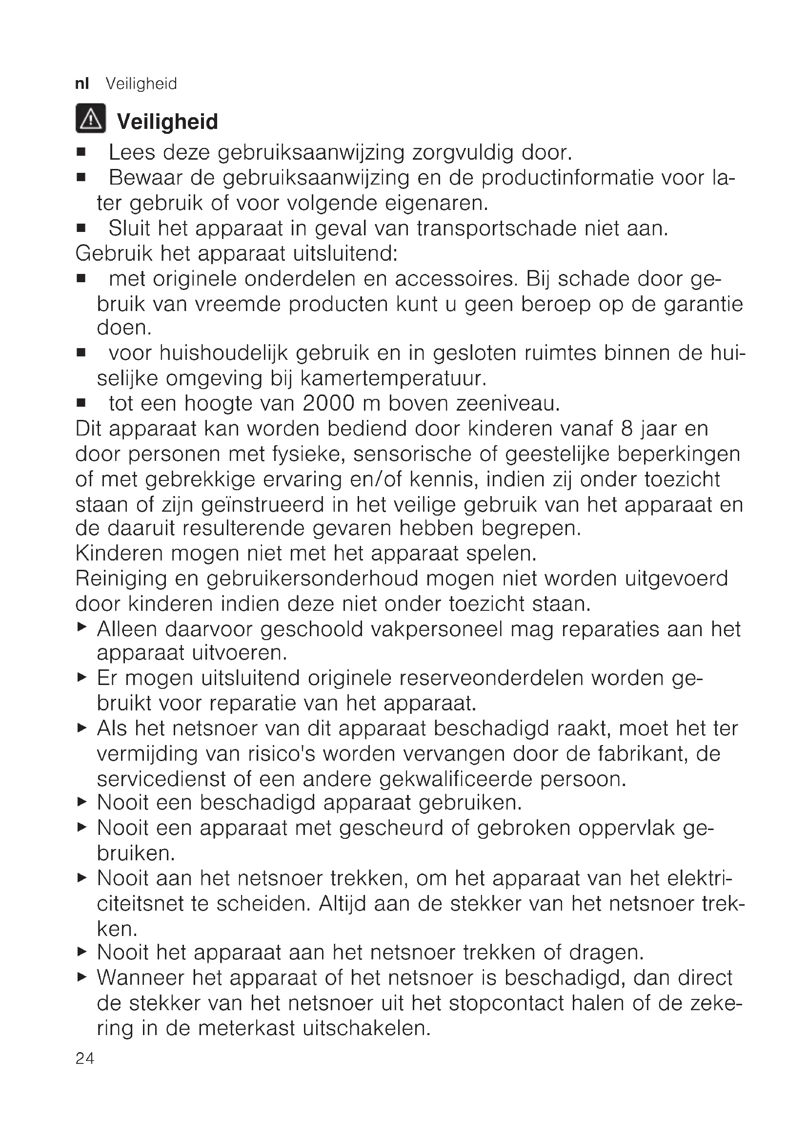 Veiligheid ¡ Lees deze gebruiksaanwijzing zorgvuldig door. ¡ Bewaar de gebruiksaanwijzing en de productinformatie voor la- ter gebruik of voor volgende eigenaren. ¡ Sluit het apparaat in geval van transportschade niet aan. Gebruik het apparaat uitsluitend: ¡ met originele onderdelen en accessoires. Bij schade door ge- bruik van vreemde producten kunt u geen beroep op de garantie doen. ¡ voor huishoudelijk gebruik en in gesloten ruimtes binnen de hui- selijke omgeving bij kamertemperatuur. ¡ tot een hoogte van 2000m boven zeeniveau. Dit apparaat kan worden bediend door kinderen vanaf 8 jaar en door personen met fysieke, sensorische of geestelijke beperkingen of met gebrekkige ervaring en/of kennis, indien zij onder toezicht staan of zijn geïnstrueerd in het veilige gebruik van het apparaat en de daaruit resulterende gevaren hebben begrepen. Kinderen mogen niet met het apparaat spelen. Reiniging en gebruikersonderhoud mogen niet worden uitgevoerd door kinderen indien deze niet onder toezicht staan.