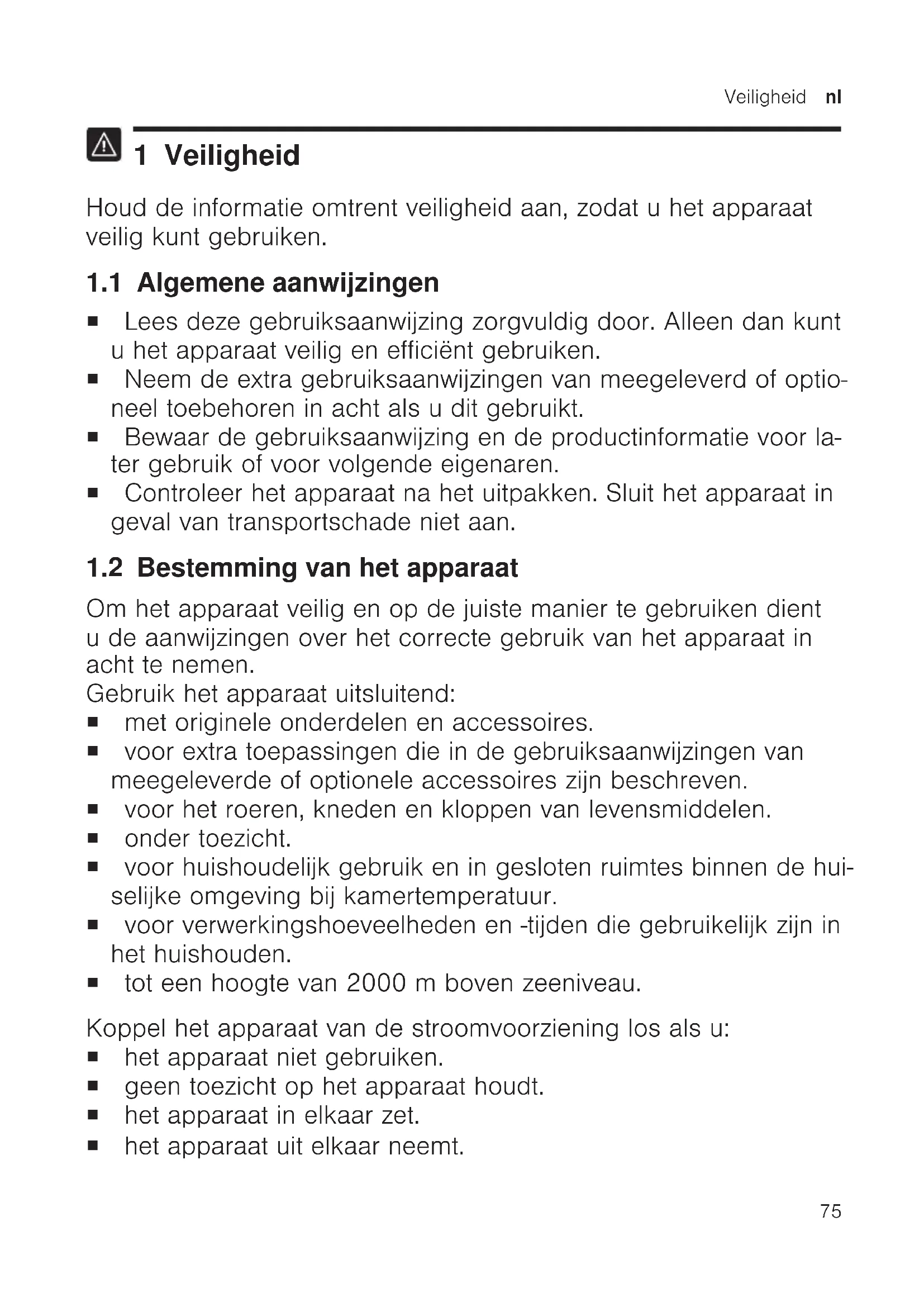 1 Veiligheid Houd de informatie omtrent veiligheid aan, zodat u het apparaat veilig kunt gebruiken. 1.1 Algemene aanwijzingen ¡ Lees deze gebruiksaanwijzing zorgvuldig door. Alleen dan kunt u het apparaat veilig en efficiënt gebruiken. ¡ Neem de extra gebruiksaanwijzingen van meegeleverd of optio- neel toebehoren in acht als u dit gebruikt. ¡ Bewaar de gebruiksaanwijzing en de productinformatie voor la- ter gebruik of voor volgende eigenaren. ¡ Controleer het apparaat na het uitpakken. Sluit het apparaat in geval van transportschade niet aan. 1.2 Bestemming van het apparaat Om het apparaat veilig en op de juiste manier te gebruiken dient u de aanwijzingen over het correcte gebruik van het apparaat in acht te nemen. Gebruik het apparaat uitsluitend: ¡ met originele onderdelen en accessoires. ¡ voor extra toepassingen die in de gebruiksaanwijzingen van meegeleverde of optionele accessoires zijn beschreven. ¡ voor het roeren, kneden en kloppen van levensmiddelen. ¡ onder toezicht. ¡ voor huishoudelijk gebruik en in gesloten ruimtes binnen de hui- selijke omgeving bij kamertemperatuur. ¡ voor verwerkingshoeveelheden en -tijden die gebruikelijk zijn in het huishouden. ¡ tot een hoogte van 2000m boven zeeniveau. Koppel het apparaat van de stroomvoorziening los als u: ¡ het apparaat niet gebruiken. ¡ geen toezicht op het apparaat houdt. ¡ het apparaat in elkaar zet. ¡ het apparaat uit elkaar neemt.nl Veiligheid