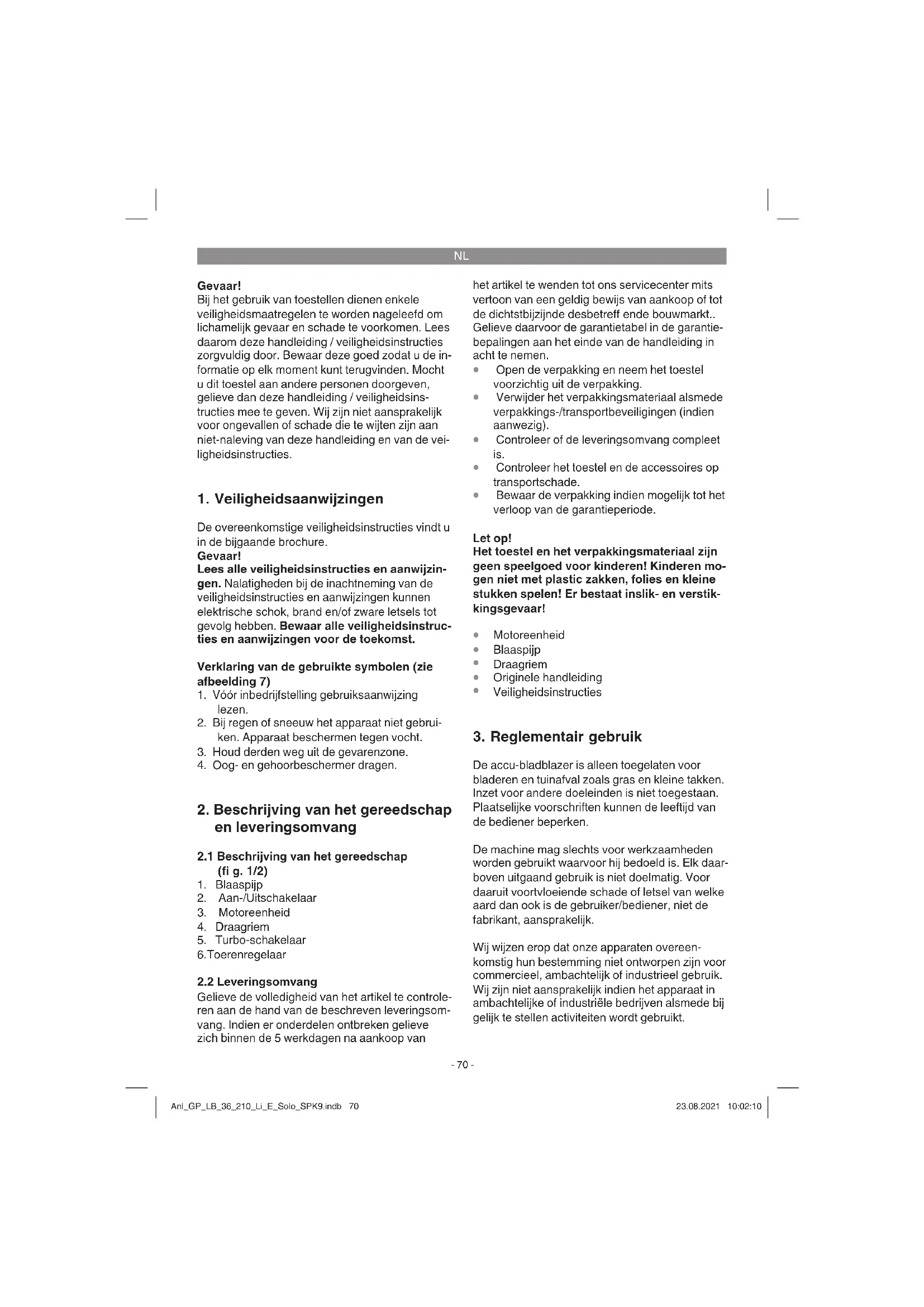 De accu-bladblazer is alleen toegelaten voor bladeren en tuinafval zoals gras en kleine takken. Inzet voor andere doeleinden is niet toegestaan. Plaatselijke voorschriften kunnen de leeftijd van de bediener beperken. De machine mag slechts voor werkzaamheden worden gebruikt waarvoor hij bedoeld is. Elk daar- boven uitgaand gebruik is niet doelmatig. Voor daaruit voortvloeiende schade of letsel van welke aard dan ook is de gebruiker/bediener, niet de fabrikant, aansprakelijk. Wij wijzen erop dat onze apparaten overeen- komstig hun bestemming niet ontworpen zijn voor commercieel, ambachtelijk of industrieel gebruik. Wij zijn niet aansprakelijk indien het apparaat in ambachtelijke of industriële bedrijven alsmede bij gelijk te stellen activiteiten wordt gebruikt. Anl_GP_LB_36_210_Li_E_Solo_SPK9.indb 70Anl_GP_LB_36_210_Li_E_Solo_SPK9.indb 70 23.08.2021 10:02:1023.08.2021 10:02:10NL