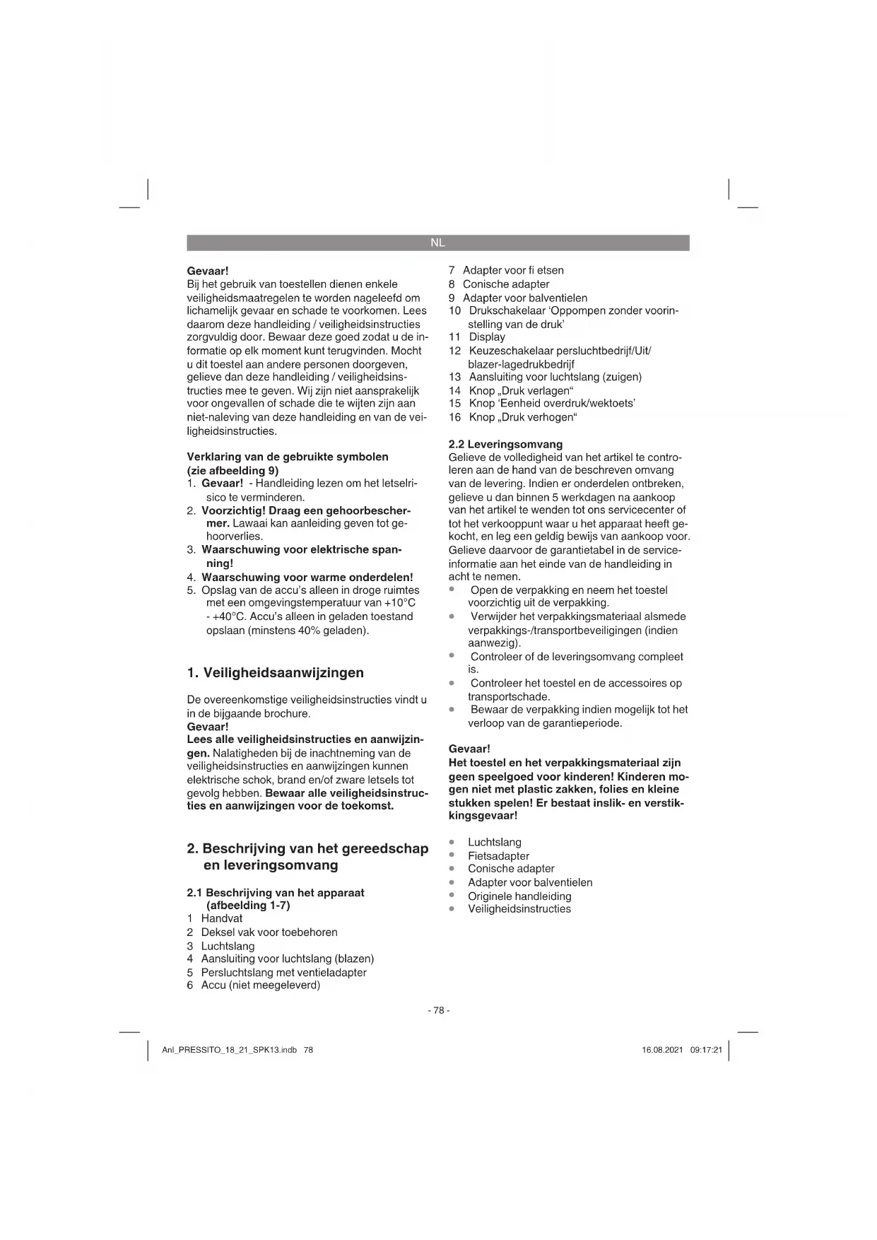 Waarschuwing! Dit apparaat is nicht geijkt! Controlleroor een geijkte meetwaarde na het vullen de bandenspanning met een geschikt meetinstrument, bijvoorbeeld bij een tankstation.