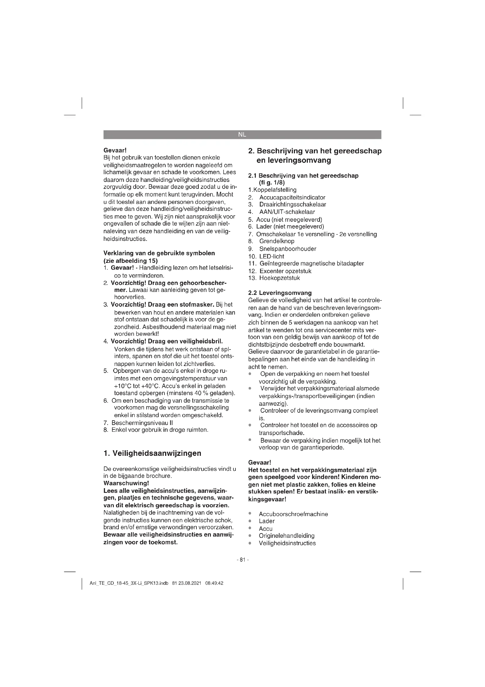 uit hand-arm-trillingen indien het toestel lang zonder onderbreking wordt gebruikt of niet naar behoren wordt gehanteerd en onder- houden. Anl_TE_CD_18-45_3X-Li_SPK13.indb 82 23.08.2021 08:49:42NL