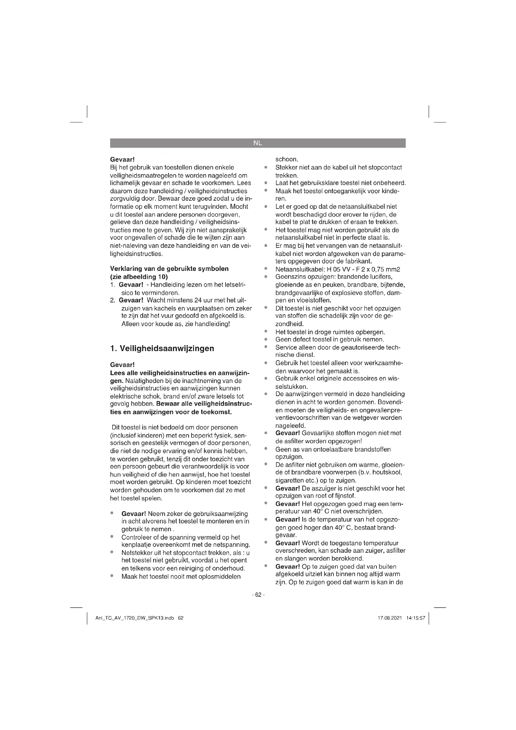De aszuiger is geschikt voor het opzuigen van koude as of koud op te zuigen goed uit schouwen, hout/kolenkachels, asbakken of bar- becue. De machine mag slechts voor werkzaamheden worden gebruikt waarvoor ze bedoeld is. Elk ander verder gaand gebruik is niet reglementair. Voor daaruit voortvloeiende schade of verwon- dingen van welke aard dan ook is de gebruiker/ bediener, niet de fabrikant, aansprakelijk. Anl_TC_AV_1720_DW_SPK13.indb 63Anl_TC_AV_1720_DW_SPK13.indb 63 17.08.2021 14:15:5717.08.2021 14:15:57NL