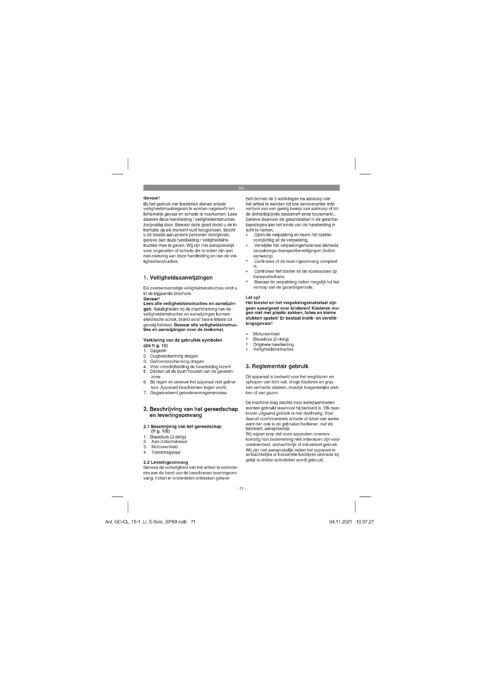 Dit apparaat is bedoeld voor het wegblazen en ophopen van licht vuil, droge bladeren en gras van verharde vlakken, moeilijk toegankelijke plek- ken of van gazon. De machine mag slechts voor werkzaamheden worden gebruikt waarvoor hij bedoeld is. Elk daar- boven uitgaand gebruik is niet doelmatig. Voor daaruit voortvloeiende schade of letsel van welke aard dan ook is de gebruiker/bediener, niet de fabrikant, aansprakelijk. Wij wijzen erop dat onze apparaten overeen- komstig hun bestemming niet ontworpen zijn voor commercieel, ambachtelijk of industrieel gebruik. Wij zijn niet aansprakelijk indien het apparaat in ambachtelijke of industriële bedrijven alsmede bij gelijk te stellen activiteiten wordt gebruikt. Anl_GC-CL_18-1_Li_E-Solo_SPK9.indb 71Anl_GC-CL_18-1_Li_E-Solo_SPK9.indb 71 04.11.2021 10:37:2704.11.2021 10:37:27NL