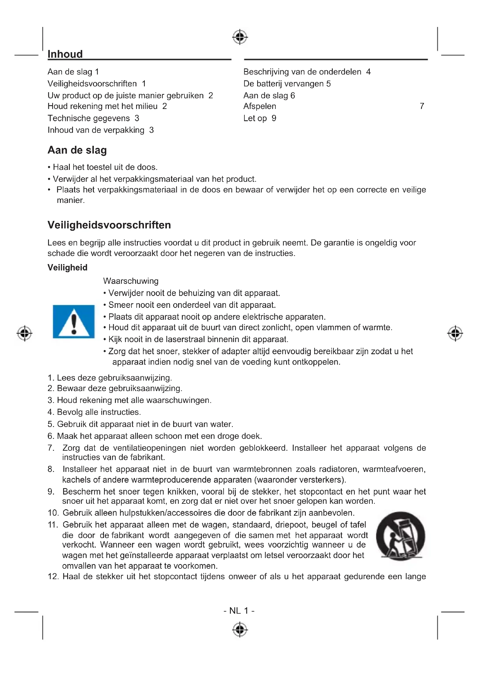 Inhoud Aan de slag 1 Veiligheidsvoorschriften 1 Uw product op de juiste manier gebruiken 2 Houd rekening met het milieu 2 Technische gegevens 3 Inhoud van de verpakking 3 Beschrijving van de onderdelen 4 De batterij vervangen 5 Aan de slag 6 Afspelen 7 Let op 9 Aan de slag