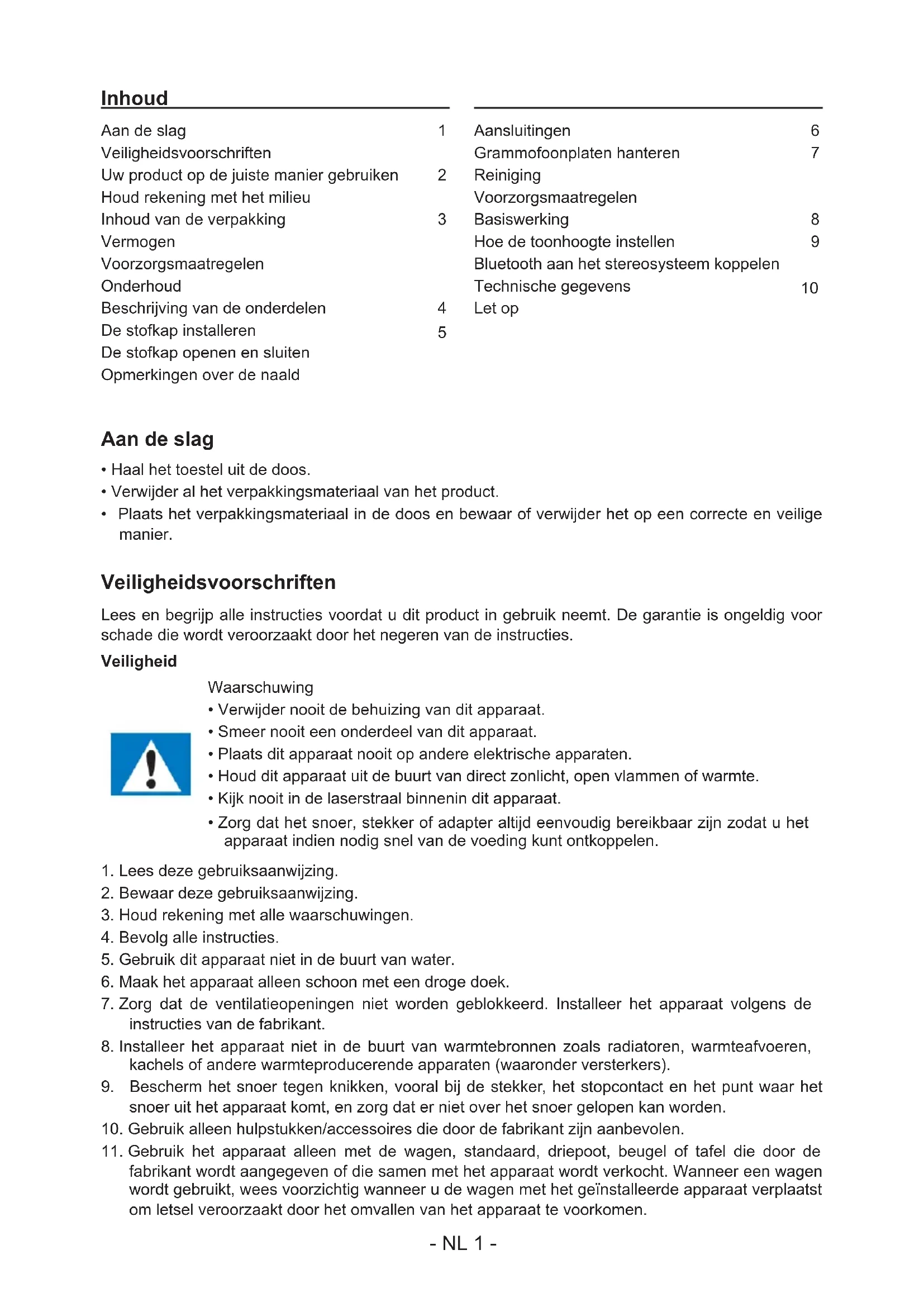 Aansluitingen Grammofoonplaten hanteren Reiniging Voorzorgsmaatregelen Basiswerking Hoe de toonhoogte instellen Bluetooth aan het stereosysteem koppelen Technische gegevens Let op Aan de slag