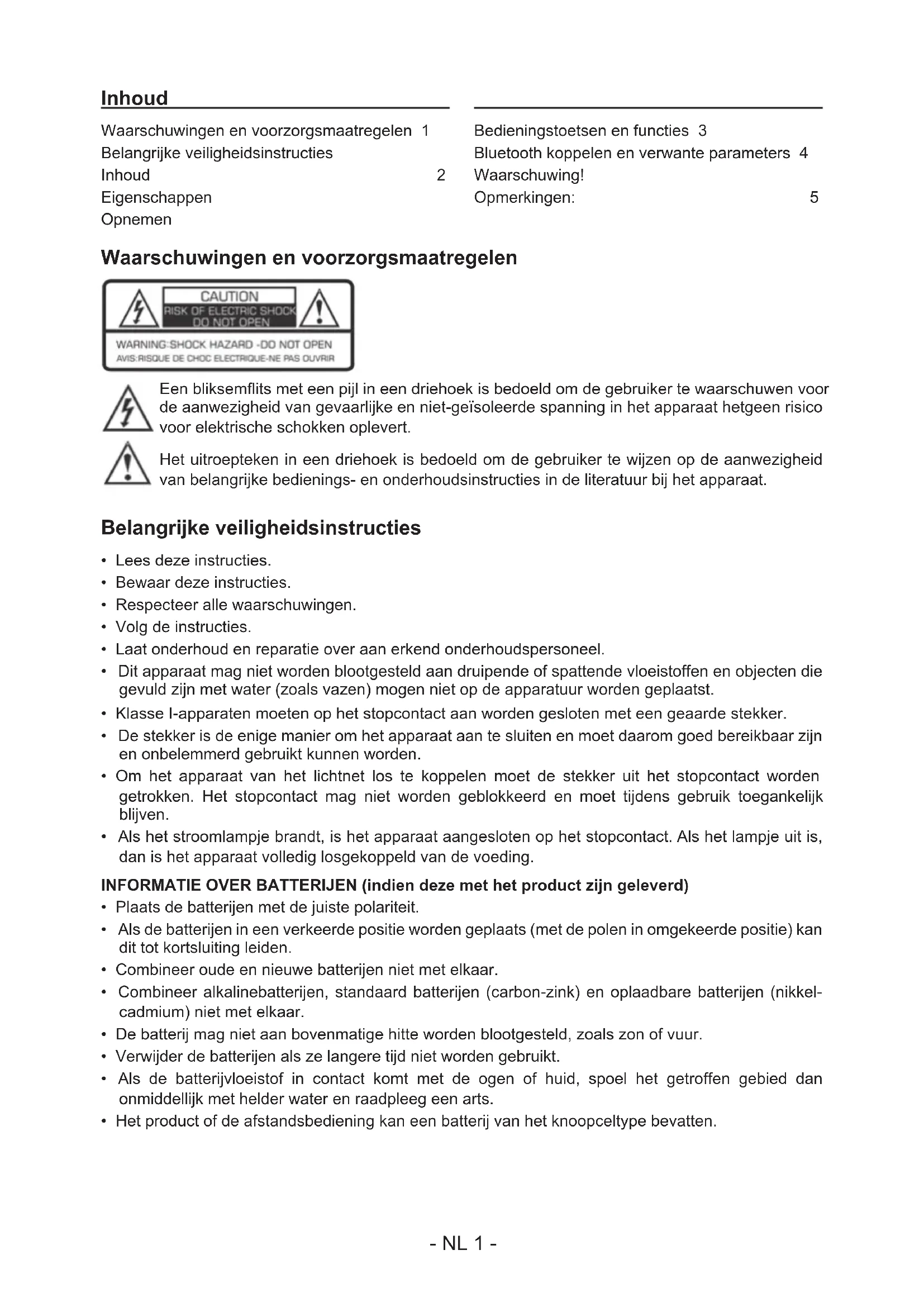 BEDIENINGSINSTRUCTIES LEES ALVORENS EEN GEBRUIK DE HANDLEIDING AANDACHTIG DOOR EN BEWAAR HET VOOR TOEKOMSTIGE NASLAG. NL- NL 1 - Inhoud Waarschuwingen en voorzorgsmaatregelen 1 Belangrijke veiligheidsinstructies Inhoud 2 Eigenschappen Opnemen Bedieningstoetsen en functies 3 Bluetooth koppelen en verwante parameters 4 Waarschuwing! Opmerkingen: 5 Waarschuwingen en voorzorgsmaatregelen Een bliksemits met een pijl in een driehoek is bedoeld om de gebruiker te waarschuwen voor de aanwezigheid van gevaarlijke en niet-geïsoleerde spanning in het apparaat hetgeen risico voor elektrische schokken oplevert. Het uitroepteken in een driehoek is bedoeld om de gebruiker te wijzen op de aanwezigheid van belangrijke bedienings- en onderhoudsinstructies in de literatuur bij het apparaat. Belangrijke veiligheidsinstructies