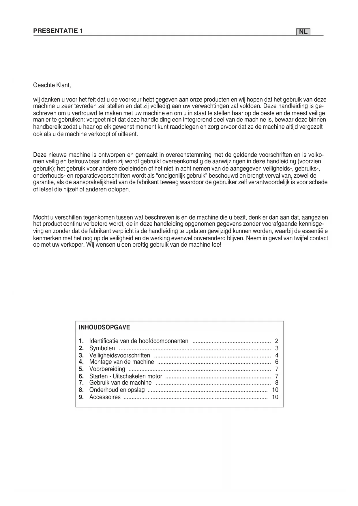 koper zal u alle nodige informatie geven o ver de meest geschikte veiligheidskledij, met het oog op een veilig gebruik van de machine.