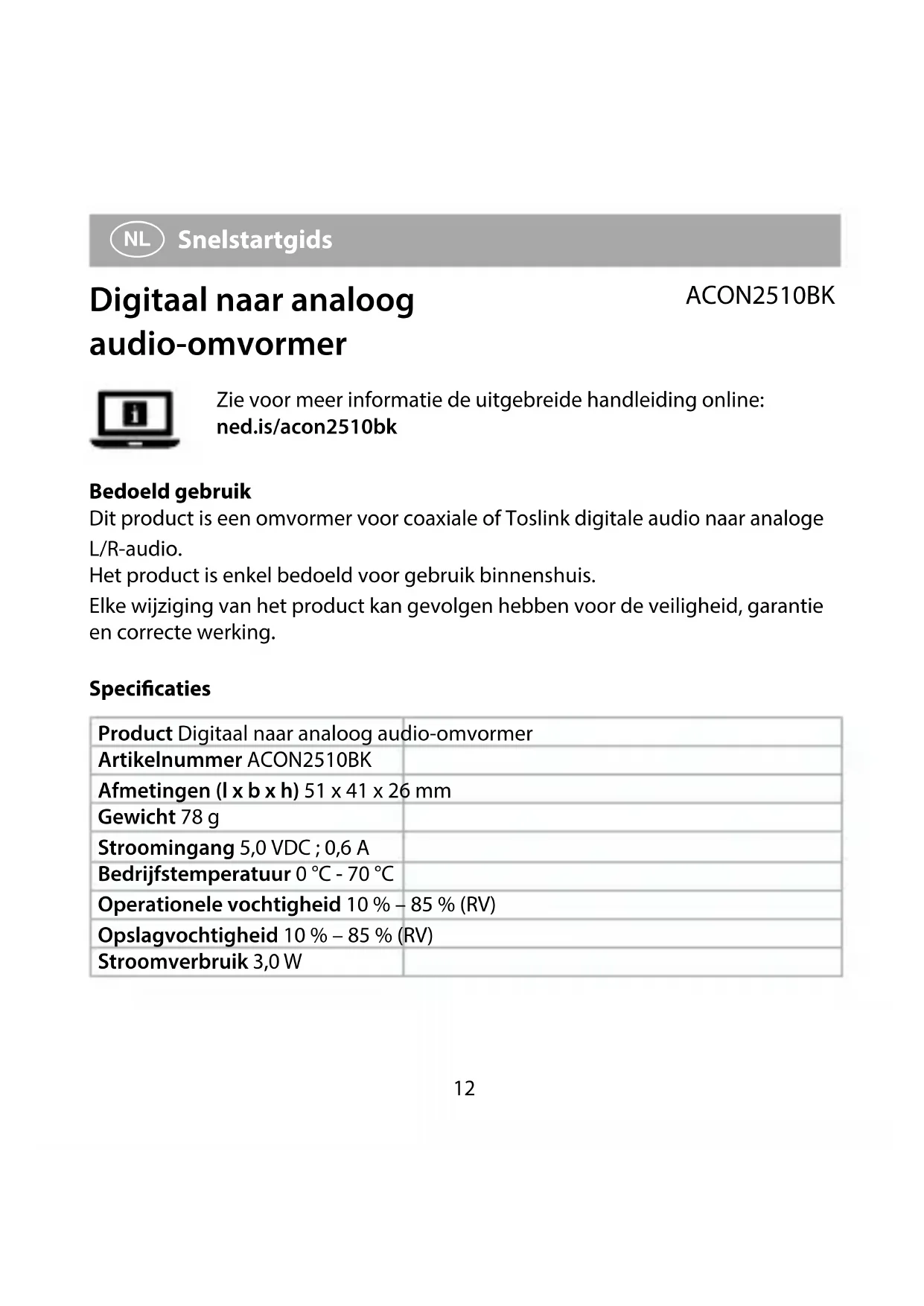 Snelstartgids Digitaal naar analoog audio-omvormer ACON2510BK Zie voor meer informatie de uitgebreide handleiding online: ned.is/acon2510bk Bedoeld gebruik Dit product is een omvormer voor coaxiale of Toslink digitale audio naar analoge L/R-audio. Het product is enkel bedoeld voor gebruik binnenshuis. Elke wijziging van het product kan gevolgen hebben voor de veiligheid, garantie en correcte werking. Specicaties Product Digitaal naar analoog audio-omvormer Artikelnummer ACON2510BK Afmetingen (l x b x h) 51 x 41 x 26 mm Gewicht 78 g Stroomingang 5,0 VDC ; 0,6 A Bedrijfstemperatuur 0 °C - 70 °C Operationele vochtigheid 10 % – 85 % (RV) Opslagvochtigheid 10 % – 85 % (RV) Stroomverbruik 3,0 W13 Ondersteunde bitrates 32 kHz 24-bit 44,1 kHz 24-bit 48 kHz 24-bit 96 kHz 24-bit Belangrijkste onderdelen (afbeelding A) 1 R/L-uitgang 2 AUX-uitgang 3 Voedingsindicatie LED 4 Coaxiale ingang 5 Toslink vrouwelijke ingang 6 Voedingspoort gelijkstroom 7 Stroomkabel Veiligheidsvoorschriften