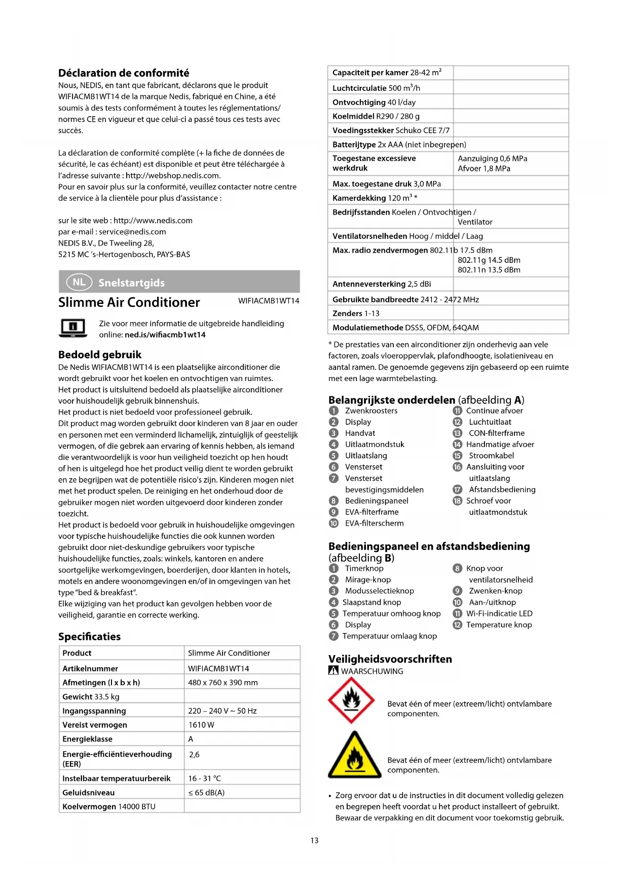 Snelstartgids Slimme Air Conditioner WIFIACMB1WT14Zie voor meer informatie de uitgebreide handleiding online: ned.is/wiacmb1wt14 Bedoeld gebruik De Nedis WIFIACMB1WT14 is een plaatselijke airconditioner die wordt gebruikt voor het koelen en ontvochtigen van ruimtes.Het product is uitsluitend bedoeld als plaatselijke airconditioner voor huishoudelijk gebruik binnenshuis.Het product is niet bedoeld voor professioneel gebruik.Dit product mag worden gebruikt door kinderen van 8 jaar en ouder en personen met een verminderd lichamelijk, zintuiglijk of geestelijk vermogen, of die gebrek aan ervaring of kennis hebben, als iemand die verantwoordelijk is voor hun veiligheid toezicht op hen houdt of hen is uitgelegd hoe het product veilig dient te worden gebruikt en ze begrijpen wat de potentiële risico's zijn. Kinderen mogen niet met het product spelen. De reiniging en het onderhoud door de gebruiker mogen niet worden uitgevoerd door kinderen zonder toezicht.Het product is bedoeld voor gebruik in huishoudelijke omgevingen voor typische huishoudelijke functies die ook kunnen worden gebruikt door niet-deskundige gebruikers voor typische huishoudelijke functies, zoals: winkels, kantoren en andere soortgelijke werkomgevingen, boerderijen, door klanten in hotels, motels en andere woonomgevingen en/of in omgevingen van het type “bed & breakfast”.Elke wijziging van het product kan gevolgen hebben voor de veiligheid, garantie en correcte werking. Specicaties Product Slimme Air ConditionerArtikelnummer WIFIACMB1WT14Afmetingen (l x b x h) 480 x 760 x 390 mmGewicht 33.5 kgIngangsspanning 220 – 240 V ~ 50 HzVereist vermogen 1610 WEnergieklasse AEnergie-eciëntieverhouding (EER) 2,6 Instelbaar temperatuurbereik 16 - 31 °CGeluidsniveau ≤ 65 dB(A)Koelvermogen 14000 BTU14