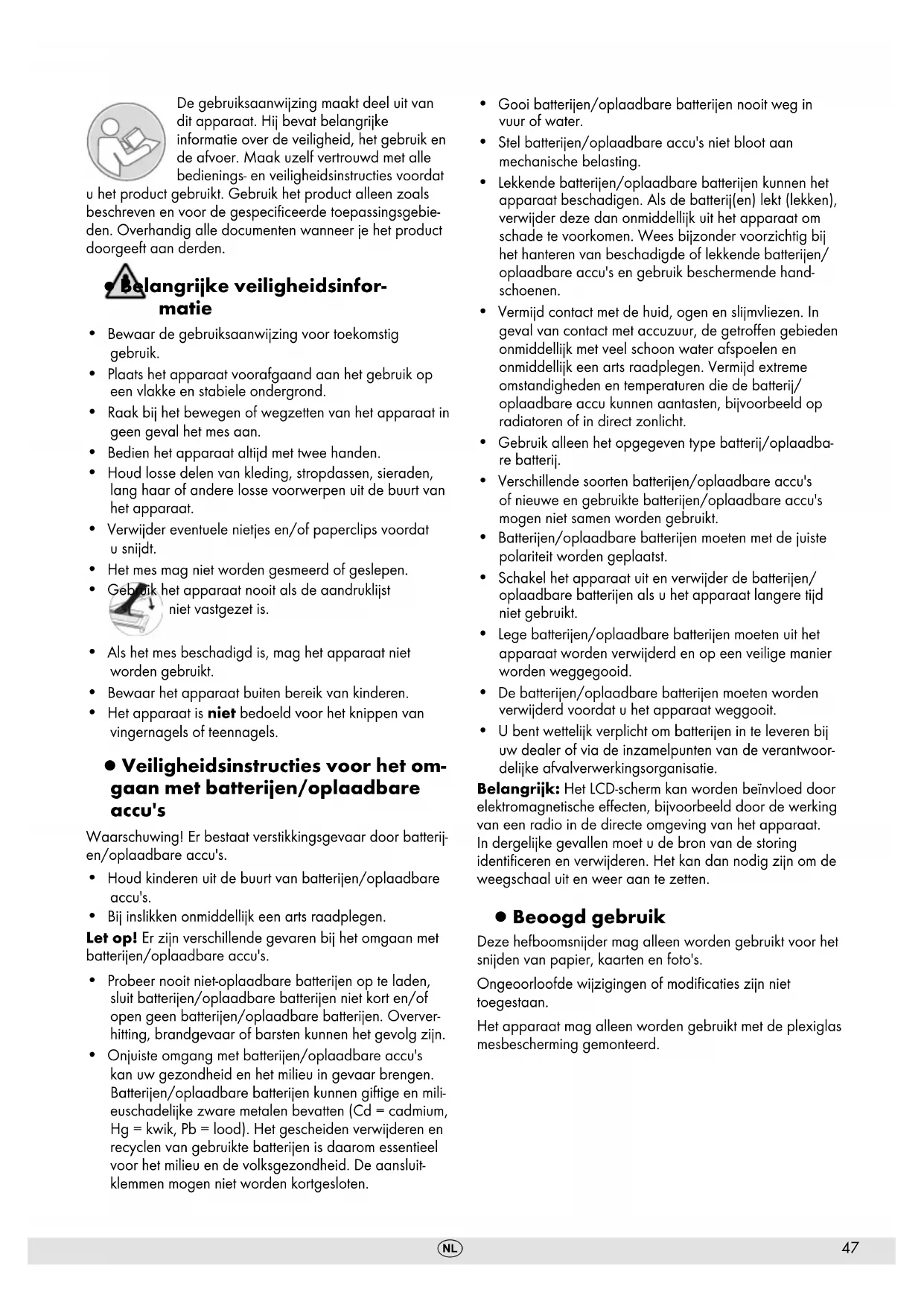 - U bent wettelijk verplicht om batterijen in te leveren bij uw dealer of via de inzamelpunten van de verantwoor- delijke afvalverwerkingsorganisatie. Belangrijk: Het LCD-scherm kan worden beïnvloed door elektromagnetische eecten, bijvoorbeeld door de werking van een radio in de directe omgeving van het apparaat. In dergelijke gevallen moet u de bron van de storing identiceren en verwijderen. Het kan dan nodig zijn om de weegschaal uit en weer aan te zetten. ▯ Beoogd gebruik Deze hefboomsnijder mag alleen worden gebruikt voor het snijden van papier, kaarten en foto's. Ongeoorloofde wijzigingen of modicaties zijn niet toegestaan. Het apparaat mag alleen worden gebruikt met de plexiglas mesbescherming gemonteerd.48