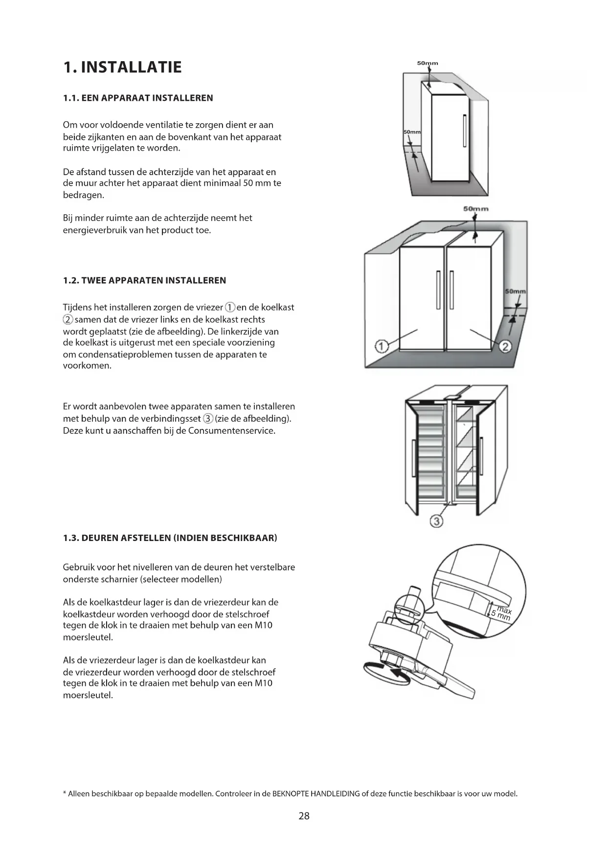 samen dat de vriezer links en de koelkast rechts wordt geplaatst (zie de afbeelding). De linkerzijde van de koelkast is uitgerust met een speciale voorziening om condensatieproblemen tussen de apparaten te voorkomen. Er wordt aanbevolen twee apparaten samen te installeren met behulp van de verbindingsset