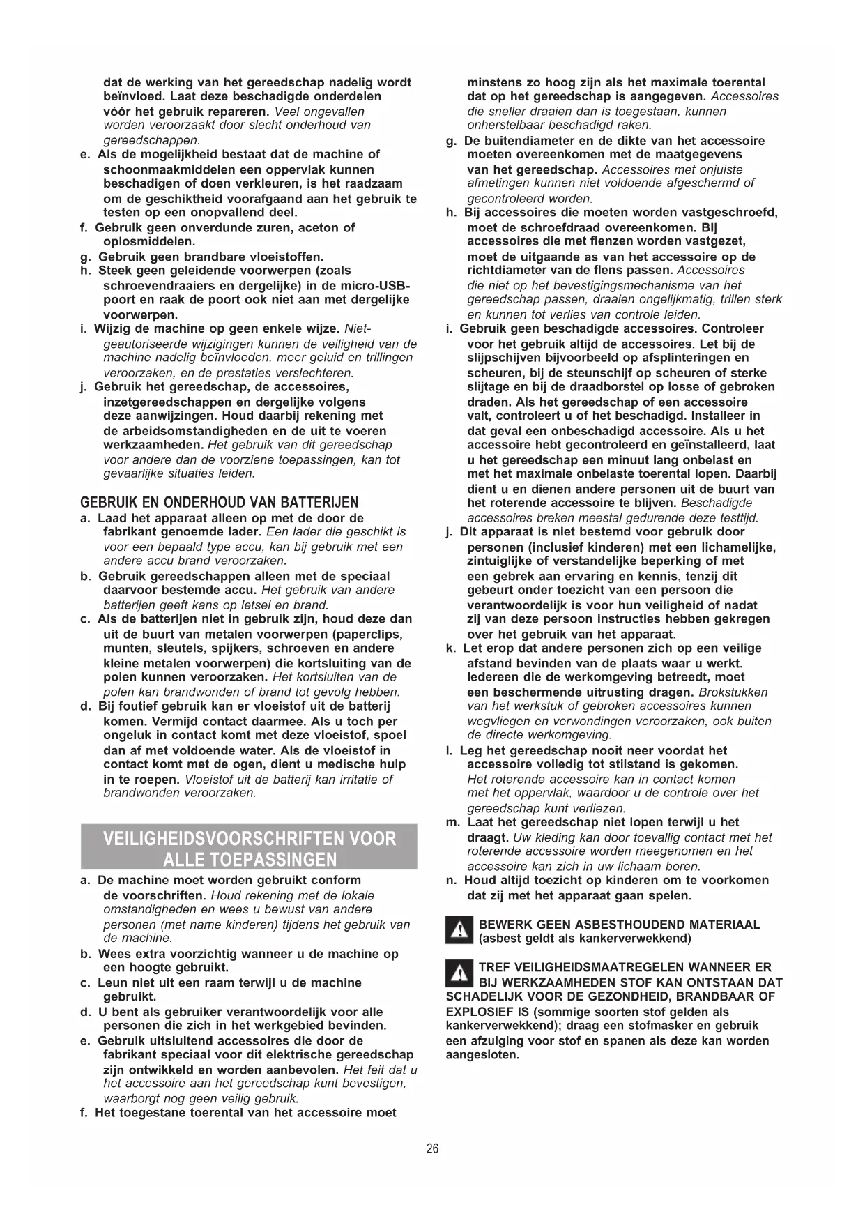 geautoriseerde wijzigingen kunnen de veiligheid van de machine nadelig beïnvloeden, meer geluid en trillingen veroorzaken, en de prestaties verslechteren. j. Gebruik het gereedschap, de accessoires, inzetgereedschappen en dergelijke volgens deze aanwijzingen. Houd daarbij rekening met de arbeidsomstandigheden en de uit te voeren werkzaamheden. Het gebruik van dit gereedschap voor andere dan de voorziene toepassingen, kan tot gevaarlijke situaties leiden.