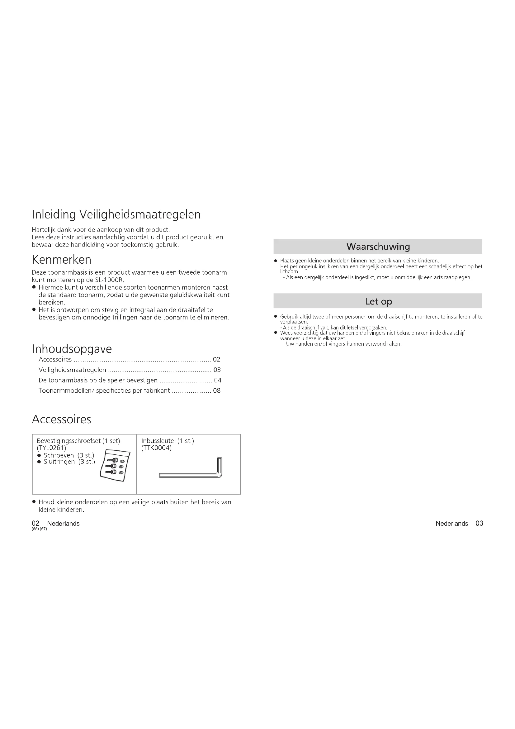Wees voorzichtig dat uw handen en/of vingers niet bekneld raken in de draaischijf wanneer u deze in elkaar zet. - Uw handen en/of vingers kunnen verwond raken. Kenmerken Deze toonarmbasis is een product waarmee u een tweede toonarm kunt monteren op de SL-1000R.