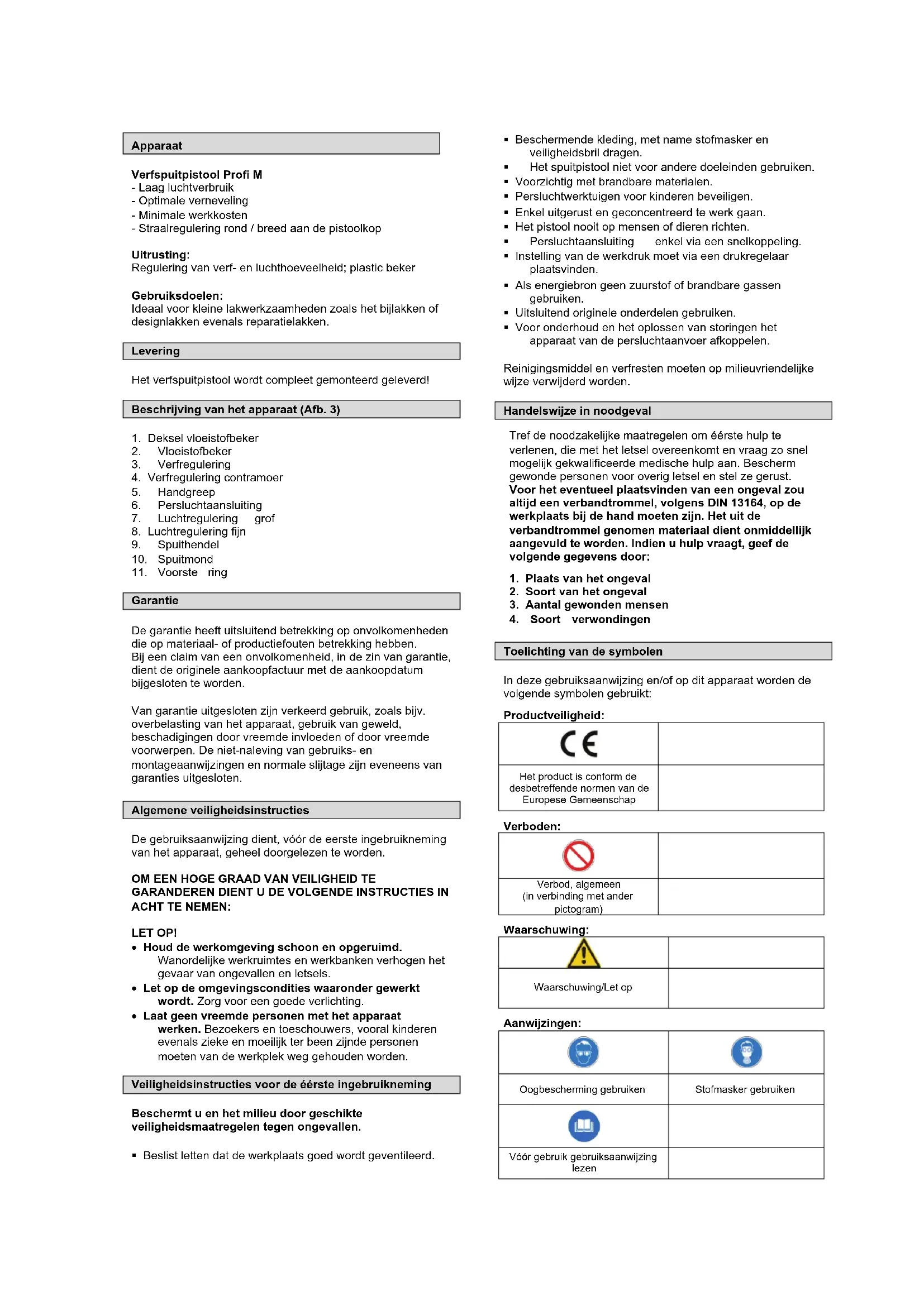 Príslušné smernice EÚ: 2006/42/EGApparaat Verfspuitpistool Profi M - Laag luchtverbruik - Optimale verneveling - Minimale werkkosten - Straalregulering rond / breed aan de pistoolkop Uitrusting: Regulering van verf- en luchthoeveelheid; plastic beker Gebruiksdoelen: Ideaal voor kleine lakwerkzaamheden zoals het bijlakken of designlakken evenals reparatielakken. Levering Het verfspuitpistool wordt compleet gemonteerd geleverd! Beschrijving van het apparaat (Afb. 3)