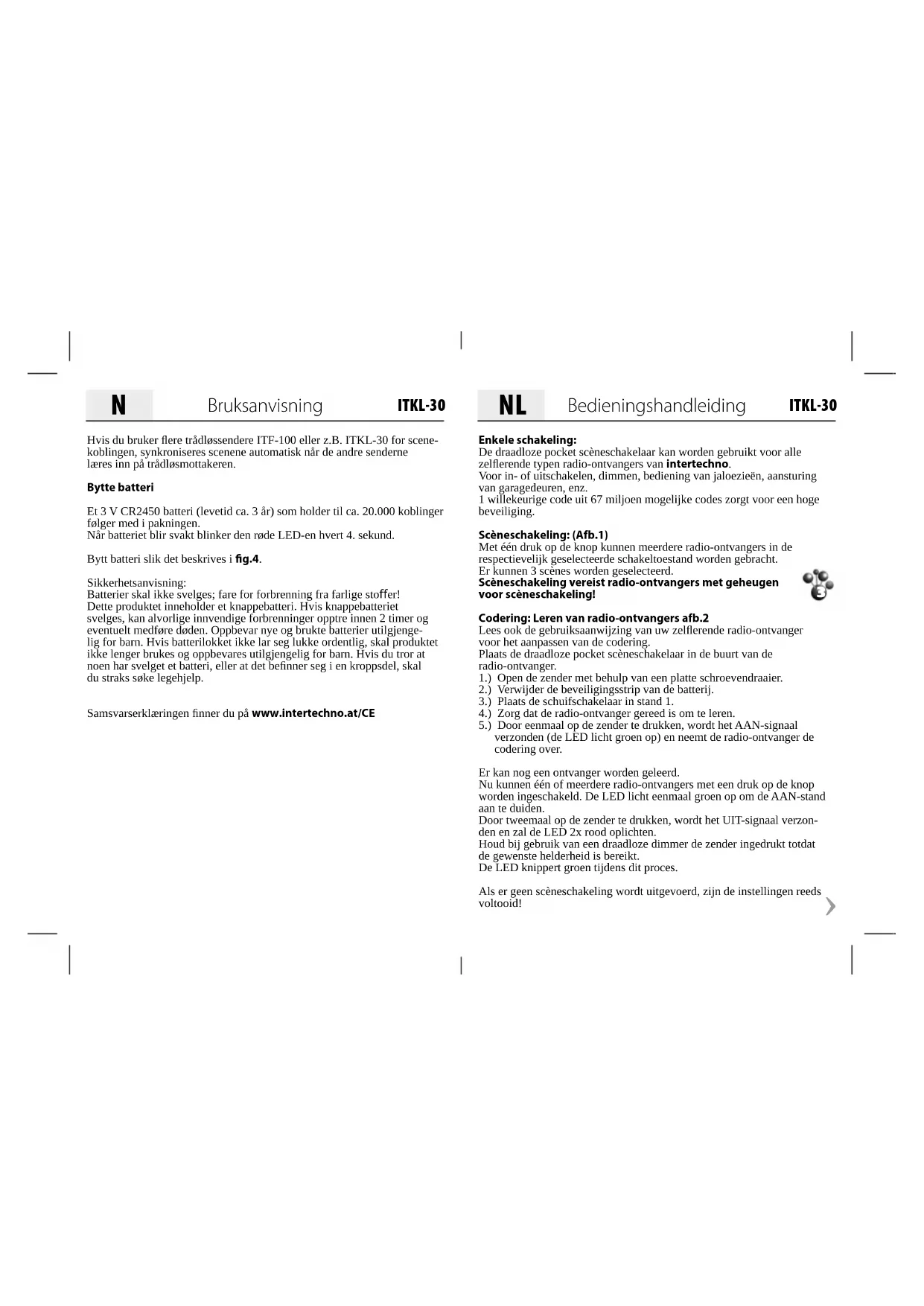ITKL-30 Enkele schakeling:De draadloze pocket scèneschakelaar kan worden gebruikt voor alle zelflerende typen radio-ontvangers van intertechno.Voor in- of uitschakelen, dimmen, bediening van jaloezieën, aansturing van garagedeuren, enz. 1 willekeurige code uit 67 miljoen mogelijke codes zorgt voor een hoge beveiliging. Scèneschakeling: (Afb.1)Met één druk op de knop kunnen meerdere radio-ontvangers in de respectievelijk geselecteerde schakeltoestand worden gebracht.Er kunnen 3 scènes worden geselecteerd. Scèneschakeling vereist radio-ontvangers met geheugen voor scèneschakeling!Codering: Leren van radio-ontvangers afb.2Lees ook de gebruiksaanwijzing van uw zelflerende radio-ontvanger voor het aanpassen van de codering.Plaats de draadloze pocket scèneschakelaar in de buurt van de radio-ontvanger.1.) Open de zender met behulp van een platte schroevendraaier. 2.) Verwijder de beveiligingsstrip van de batterij.3.) Plaats de schuifschakelaar in stand 1.4.) Zorg dat de radio-ontvanger gereed is om te leren.5.) Door eenmaal op de zender te drukken, wordt het AAN-signaal verzonden (de LED licht groen op) en neemt de radio-ontvanger de codering over.Er kan nog een ontvanger worden geleerd.Nu kunnen één of meerdere radio-ontvangers met een druk op de knop worden ingeschakeld. De LED licht eenmaal groen op om de AAN-stand aan te duiden. Door tweemaal op de zender te drukken, wordt het UIT-signaal verzon-den en zal de LED 2x rood oplichten.Houd bij gebruik van een draadloze dimmer de zender ingedrukt totdat de gewenste helderheid is bereikt. De LED knippert groen tijdens dit proces.Als er geen scèneschakeling wordt uitgevoerd, zijn de instellingen reeds voltooid! Bedieningshandleiding