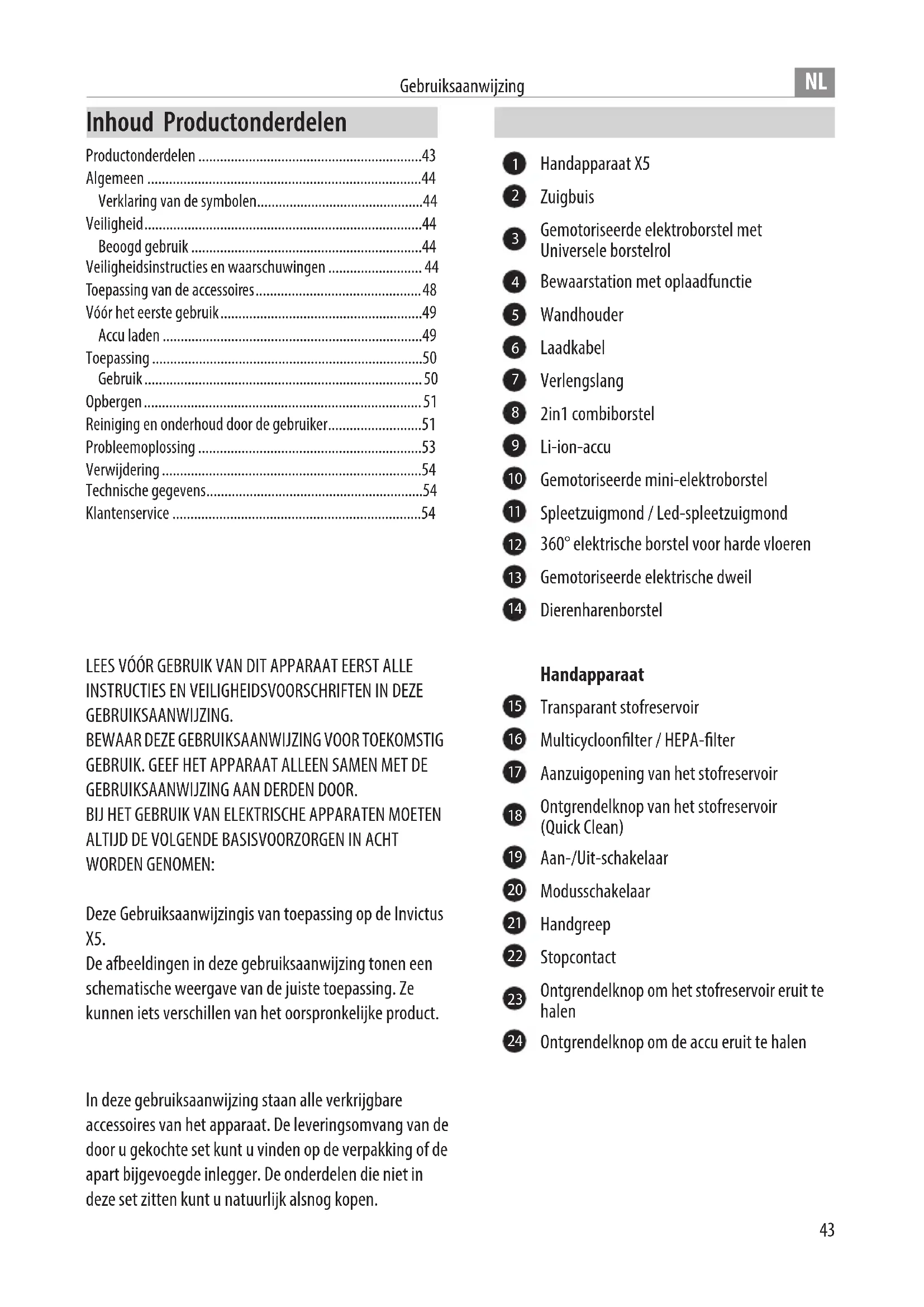 In deze gebruiksaanwijzing staan alle verkrijgbare accessoires van het apparaat. De leveringsomvang van de door u gekochte set kunt u vinden op de verpakking of de apart bijgevoegde inlegger. De onderdelen die niet in deze set zitten kunt u natuurlijk alsnog kopen. Inhoud Productonderdelen LEES VÓÓR GEBRUIK VAN DIT APPARAAT EERST ALLE
