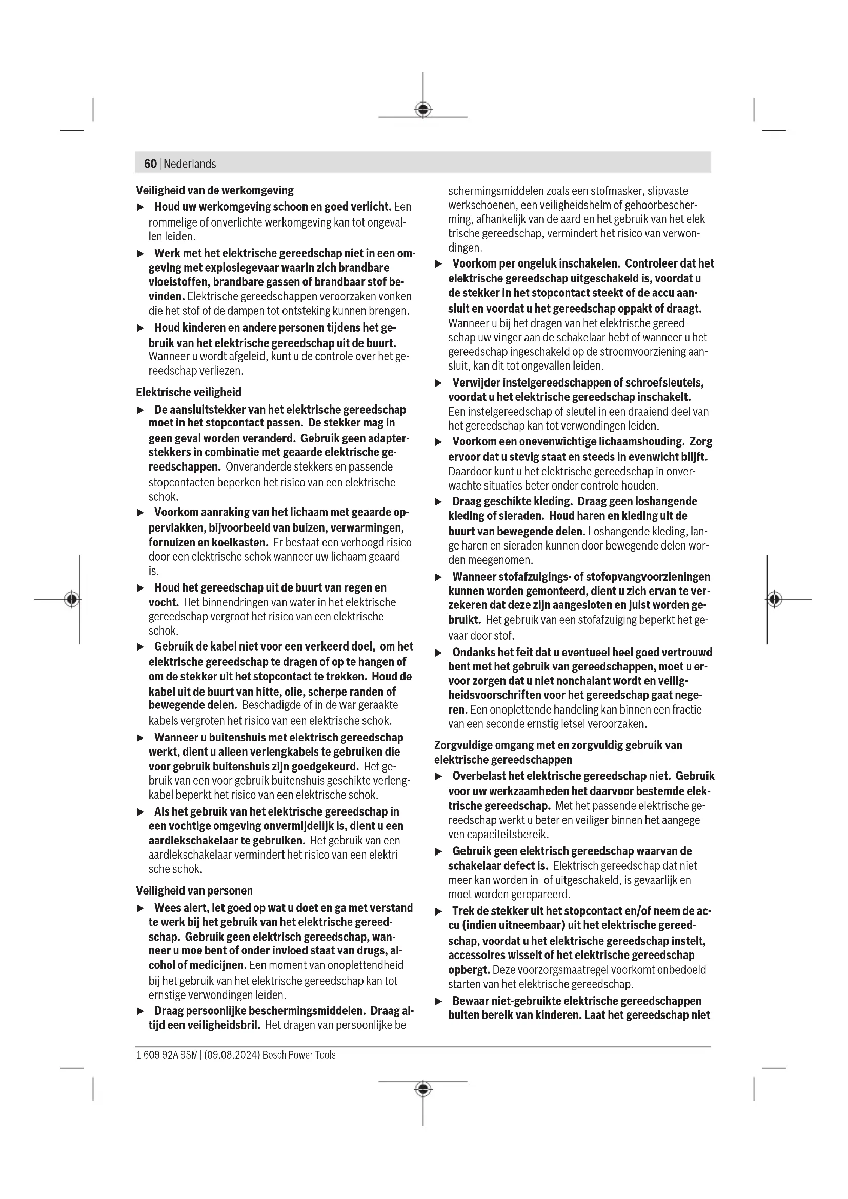 Het in deze gebruiksaanwijzing vermelde trillingsniveau en de geluidsemissiewaarde zijn gemeten met eengenormeer- de meetmethode en kunnen worden gebruikt om elektrische gereedschappen met elkaar te vergelijken. Ze zijn ook ge- schikt voor een voorlopige inschatting van de trillings- en ge- luidsemissie. Het aangegeven trillingsniveau en de aangegeven ge- luidsemissiewaarde representeren de voornaamste toepas- singen van het elektrische gereedschap. Wanneer het elek- trische gereedschap echter wordt gebruikt voor andere toe- passingen, met afwijkende inzetgereedschappen of onvol- doende onderhoud, dan kunnen het trillingsniveau en de ge- luidsemissiewaarde afwijken. Dit kan de trillings- en ge- luidsemissie gedurende de gehele arbeidsperiode duidelijk verhogen. Voor een nauwkeurige schatting van de trillings- en ge- luidsemissies moet ook rekening worden gehouden met de tijden waarin het gereedschap uitgeschakeld is, of waarin het gereedschap wel loopt, maar niet werkelijk wordt ge- bruikt. Dit kan de trillings- en geluidsemissies gedurende de gehele arbeidsperiode duidelijk verminderen. Leg aanvullende veiligheidsmaatregelen ter bescherming van de gebruiker tegen het effect van trillingen vast, zoals: onderhoud van elektrische gereedschappen en inzetgereed- schappen, warm houden van de handen, organisatie van het arbeidsproces. Aanwijzingen m.b.t. de nauwkeurigheid De verlaging van het toerental (vooral onder 50%) kan een verlaging van het maximale draaimoment tot gevolg hebben. Het verhoogde toerental bij de Power Boost-modus kan in- vloed hebben op de nauwkeurigheid en het uitschakelge- drag. De koppeling kan hierdoor doordraaien. Onderzoeken naar de machinecapaciteit worden gewoonlijk verricht bij 600min-1 conform VDI2647. Veranderingen van het toerental en/of van het draaimoment kunnen de nauwkeurigheid beïnvloeden. De machinecapaciteit moet met de desbetreffende instelling worden gecontroleerd. Accu Bosch verkoopt accugereedschap ook zonder accu. Of bij de levering van uw elektrische gereedschap een accu inbegre- pen is, kunt u zien op de verpakking. Accu opladen u Gebruik alleen de in de technische gegevens vermelde oplaadapparaten. Alleen deze oplaadapparaten zijn af- gestemd op de bij het elektrische gereedschap gebruikte Li-Ion-accu. Aanwijzing: lithium-ion-accu's worden vanwege internatio- nale transportvoorschriften gedeeltelijk geladen geleverd. 1 609 92A 9SM | (09.08.2024) Bosch Power ToolsNederlands | 65 Om het volledige vermogen van de accu te waarborgen, laadt u vóór het eerste gebruik de accu volledig op. Accu plaatsen Schuif de geladen accu in de accuhouder tot deze is vastge- klikt. Accu verwijderen Voor het verwijderen van de accu drukt u op de accu-ont- grendelingstoetsen en trekt u de accu uit het elektrische ge- reedschap. Gebruik daarbij geen geweld. Accu-oplaadaanduiding (gele LED) Accu-oplaad- aanduiding Betekenis Knipperlicht + geluidssig- naal Accu laden: er zijn nog maar 6–8 schroefverbindingen mogelijk. Continulicht + geluidssig- naal Capaciteit is niet meer voldoende voor een nieuwe schroefverbinding of het elektrische gereedschap werd overbelast: het elektrische gereedschap kan niet meer ingeschakeld worden. – Verwijder de accu en plaats weer een vol- ledig opgeladen accu. Knipperlicht Elektrisch gereedschap is oververhit en bui- ten gebruik: – Wacht tot het knipperen na korte tijd au- tomatisch ophoudt, voordat u het elektri- sche gereedschap opnieuw in gebruik neemt. Als de accu(7) erin wordt gestoken en op de aan/uit- schakelaar(8) wordt gedrukt, laat de accu-oplaadaandui- ding de laadtoestand van de accu gedurende 5 seconden zien. Accu-oplaadaanduiding Capaciteit Groen 60–100% Geel 30–60% Rood 0–30% Aanwijzingen voor de optimale omgang met de accu Bescherm de accu tegen vocht en water. Bewaar de accu alleen bij een temperatuur tussen –20 °C en 50 °C. Laat de accu bijvoorbeeld in de zomer niet in de auto liggen. Een duidelijk kortere gebruiksduur na het opladen duidt erop dat de accu versleten is en moet worden vervangen. Neem de aanwijzingen met betrekking tot afvalverwijdering in acht. Montage u Neem de accu vóór alle werkzaamheden aan het elek- trische gereedschap (bijv. onderhoud, wisselen van accessoires, enz.) uit het elektrische gereedschap. Bij per ongeluk bedienen van de aan/uit-schakelaar bestaat gevaar voor letsel. Gebruiks- en opslagomgeving Het elektrische gereedschap is uitsluitend geschikt voor ge- bruik in een gesloten ruimte. Voor een correcte werking moet de toegestane omgevings- temperatuur tussen 0 °C en +45 °C liggen, bij een toegesta- ne relatieve luchtvochtigheid tussen 20 en 95 % vrij van be- dauwing. Ophangvoorziening (zie afbeeldingA) Met de ophangbeugel(12) kunt u het elektrische gereed- schap aan een ophangvoorziening bevestigen. – Zet de ophangbeugel(12) op het elektrische gereed- schap en laat deze in de openingen(13) vastklikken. u Controleer regelmatig de toestand van de ophangbeu- gel en van de haken in de ophangvoorziening. Montage van de 180W haakse kop (zie afbeeldingB) Bij deze haakse industrie-accuschroevendraaiers moet eerst een adapter en een passende haakse schroefkop (zie „Tech- nische gegevens“, Pagina63) gemonteerd worden. – Zet de 180W haakse kop op de adapter en draai deze met een steeksleutel(16) op het sleutelvlak van de wartelmoer(14) vast. Houd daarbij met de steeksleutel(17) op het sleutelvlak van de adapter(15) tegen. u Schroefdraad en flensschroefdraad moeten vetvrij zijn, eveneens moet het juiste draaimoment (zie „Technische gegevens“, Pagina63) worden toegepast zodat de haak- se kop niet los kan laten. – Draai de contramoer(18) in pijlrichting a (linkse schroef- draad) helemaal naar achter. – Draai nu de adapter in pijlrichting a (linkse schroefdraad) helemaal naar achter. u Zet het elektrische gereedschap nooit bij de behui- zingsschalen vast. – Draai de adapter naar rechts terug tot de haakse kop zich in de gewenste positie bevindt, maximaal 360°. – Zet